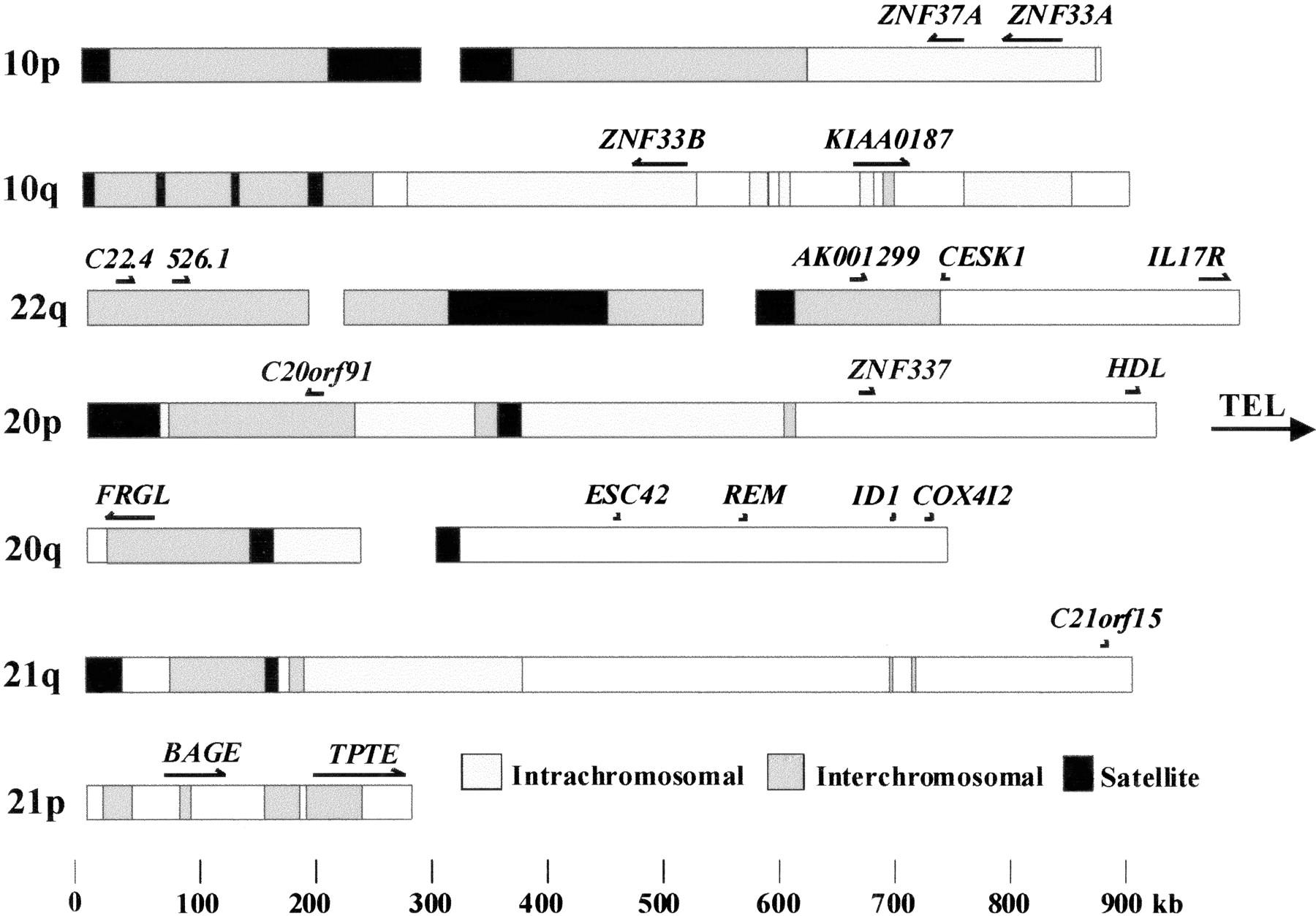 Comparison of 10p11 with other human pericentromeric sequences. Annotations were taken from Deloukas et al. 2001; Hattori et al. 2000;Dunham et al. 1999; Guy et al. 2000; and Bailey et al. 2002. Additional annotations from the working draft April 2001 freeze (http://genome.ucsc.edu/) and ongoing chromosome specific programs (http://hgp.gsc.riken.go.jp/data_tools/data_chr21_seq_annotation.html,http://www.sanger.ac.uk/cgi-bin/humace/SuperMap22/) were also analyzed. Only gene annotations supported by both spliced ESTs and ab initio gene predictions are shown. These were analyzed further by aligning the ESTs which define the gene to all closely related genomic sequences within the human draft. On the basis of this, C20orf191 andMLLT10L, which map proximal of satellite sequences on chromosome 20 (Deloukas et al. 2001), were discounted as the ESTs which define these genes only share ∼95% identity to the chromosome 20 genomic sequence. The positions of major interchromosomal and intrachromosomal duplications are shown in dark and light grey respectively. The intrachromosomal duplications on 20p and 20q have also been duplicated interchromosomally. 526.1–ap000526.1,c22.4–ap000523.c22.4.