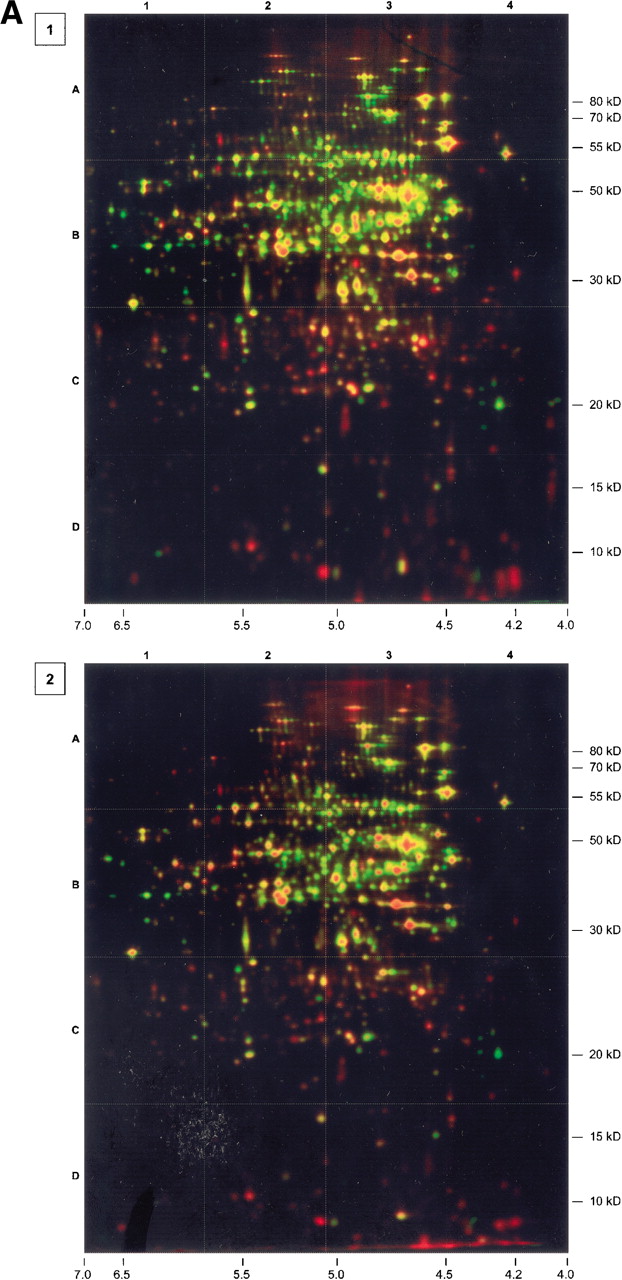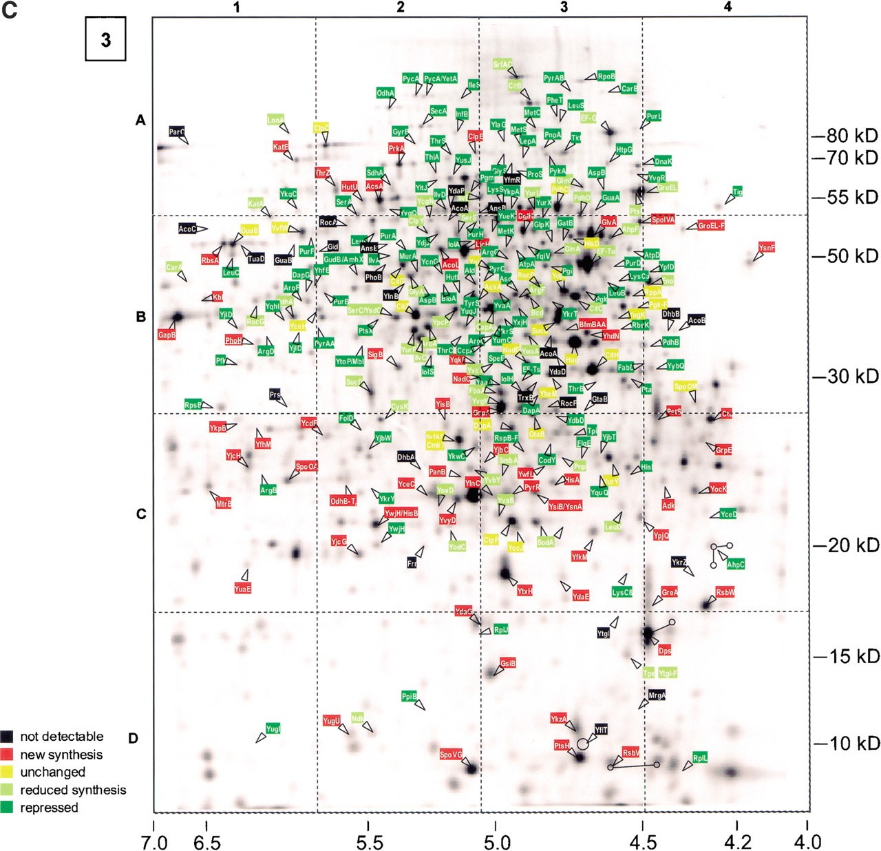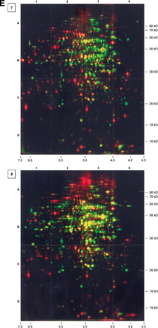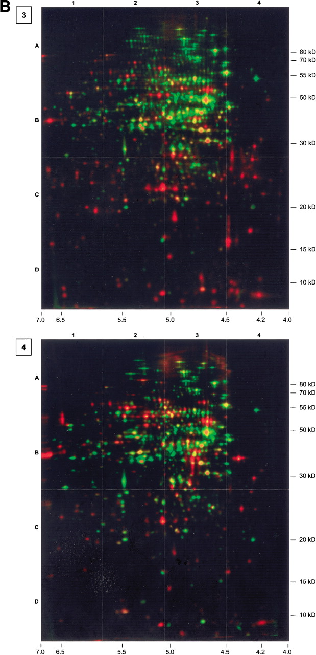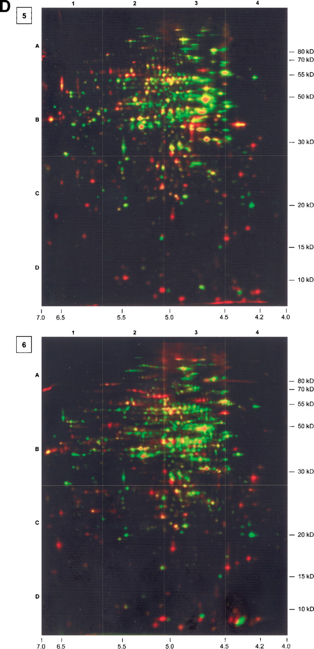 Series of dual channel images (silver-stained protein amount, green; autoradiogram of currently synthesized protein, red). Numbers in boxes associate the images to the corresponding growth phase. For further information, see Figure 1. Gel 3 was complemented by a separate autoradiogram showing protein spots that had already been identified. The colors of the text boxes indicate the relative synthesis compared with exponential growth conditions (black, not detected; red, induced; yellow, unchanged; light green, slightly repressed; green, repressed).