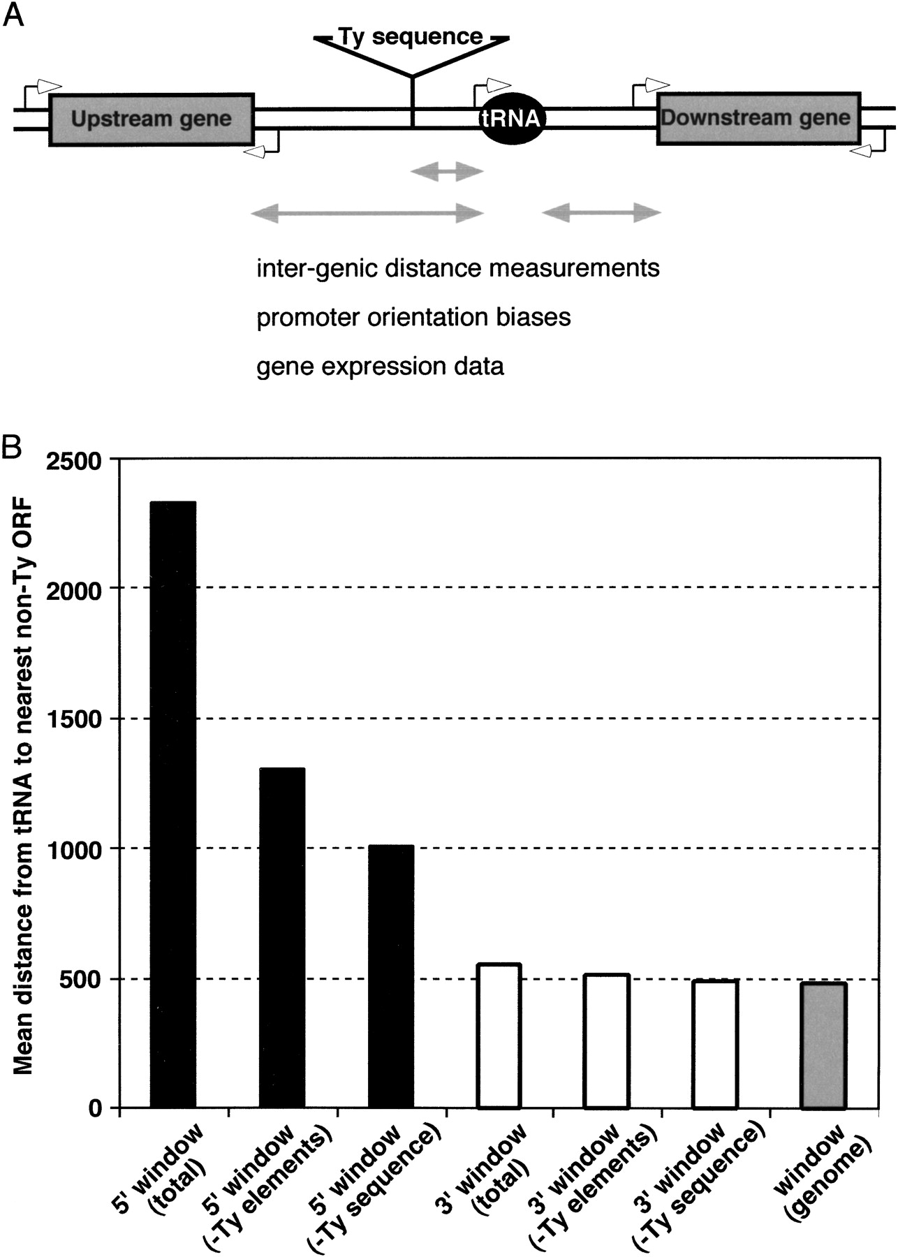The tRNA gene loci database. (A) Graphic representation of the data included in the tRNA gene and Ty element database. Gene and Ty sequence nomenclature, coordinates and orientations are according to SGD. Gene expression data is according to the yeast Transcriptome database (Holstege et al. 1998). Intergenic distance measurements were based on the ORF coordinates assigned by SGD and not the start sites of transcription which remain to be determined for many genes. (B) The average intergenic window size upstream (5′, black bars) and downstream (3′, white bars) of all the tRNA genes in the genome (total). The average intergenic window size upstream (5′, black bars) and downstream (3′, white bars) of all the tRNA genes in the genome (total); if full-length Ty elements are excluded (-Ty elements); and if Ty element and LTR sequences are excluded (-Ty sequence) from the intergenic windows. The calculated mean genome-wide inter-ORF distance excluding telomeric regions (genome, gray) is indicated.