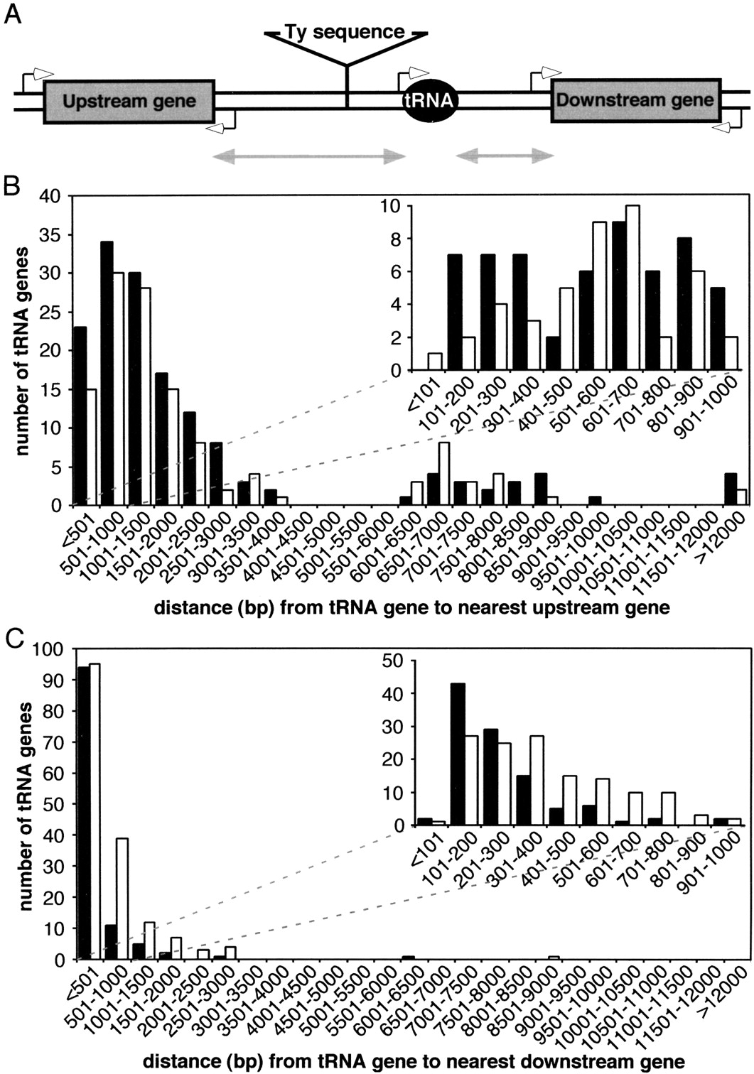 Genomic distribution of the distances from tRNA genes to their nearest neighbor genes. (A) Cartoon of the generic tRNA locus in the yeast genome. The gray double-headed arrows represent the distances from tRNA genes to their nearest (B) upstream and (C) downstream genes. Solid bars represent tRNA genes that are transcribed in the opposite direction as the neighboring gene, and open bars represent tRNA genes that are transcribed in the same direction as the nearby gene. The minor peaks in the distributions for distances >6,000 and 12,000 bp indicate the presence of one or two full-length Ty elements, respectively.