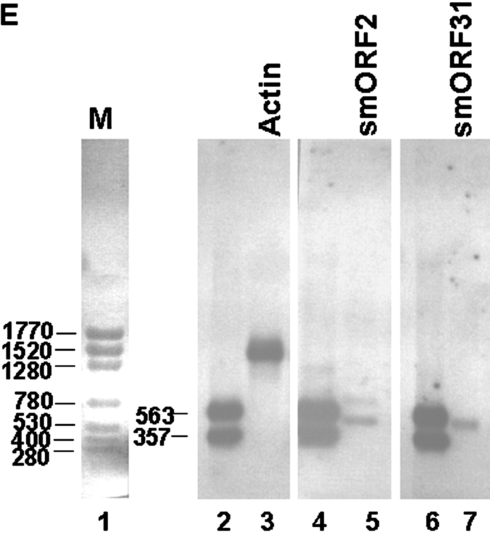 Experimental validation of the S. cerevisiae smORFs. (A) Primers specific for the yeast ACT1 gene as well as the three smORFs were used for PCR amplification using no template (lanes 1,5,9,13), 50 ng genomic DNA (lanes 2,6,10,14), 500 ng total RNA from cells grown in rich media (lanes3,7,11,15), and 500 ng total RNA from cells grown in minimal media (lanes4,8,12,16) .(B) Primers specific for the yeast ACT1 gene as well as the three smORFs were used for RT-PCR amplification using no template (lanes1,4,7,10), 500 ng total RNA from cells grown in rich media (lanes2,5,8,11), and 500 ng total RNA from cells grown in minimal media (lanes3,6,9,12). PCR and RT-PCR products were fractionated on a 1% agarose gel with DNA size markers and visualized after ethidium bromide staining. Sizes of DNA fragments in bp are indicated. (C) Two-step orientation-specific RT-PCR. Primers whose sequence is complementary to the predicted mRNAs of smORF2, 8, and 31 were used for first-strand cDNA synthesis. After heat inactivation of the reverse transcriptase, PCR amplification was carried out with both smORF-specific primers (lanes5,6,11,12,17,18). As control, the experiment was repeated using primers with the same sequence as the mRNA for first-strand cDNA synthesis (lanes3,4,9,10,15,16). (D) Examples of RT-PCR results with various smORFs indicated on top. RT-PCR detection of transcripts from the annotated smORFs YLL018C-A and YHR132W-A are shown. smORFs for which RT-PCR reactions resulted in no products are indicated (*) as are those for which the product is not of the expected size (∧). These smORFs were not included in Table 1. Sizes of DNA fragments in bp are indicated. (E) Transcript size determination by Northern analysis of the ACT1 (lane 3), smORF2 (lane 5), and smORF31 (lane7). Unlabeled RNA markers stained with methylene blue (lane1) and labeled RNA markers (lanes2,4,6) were fractionated together with yeast poly (A)+ RNA. Sizes are shown in nucleotides.