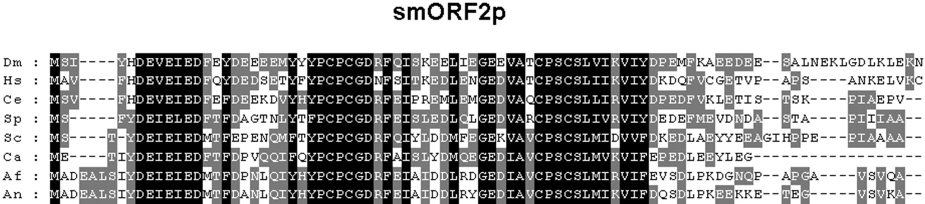 Multiple sequence alignments for smORF2p. smORF2p has highly conserved homologs in other fungi and in mammalian species. Abbreviations: Dm,Drosophila melanogaster; Hs, Homo sapiens; Ce,Caenorhabditis elegans; Sc, Saccharomyces cerevisiae; Ca, Candida albicans; Af, Aspergillus fumigatus; An,Aspergillus nidulans; Sp, Schizosaccharomyces pombe; Bt, Bos taurus; Mm, Mus musculus. Residues that are identical or similar in all protein homologs are shaded in black, and those identical or similar in two or more, but not all, proteins in the alignment are shaded in gray. Homology shading was done with GeneDoc (Nicholas et al. 1997).