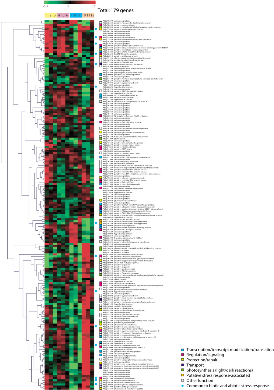 Gene expression in various tissues. A total of 179 genes that showed significant differences in expression compared to corresponding reference samples were subjected to average linkage hierarchical clustering with a Euclidean distance metric. Predicted role categories are denoted by color-coded squares; genes also found to be significantly regulated in response to both abiotic and biotic stresses are denoted with blue circles.
