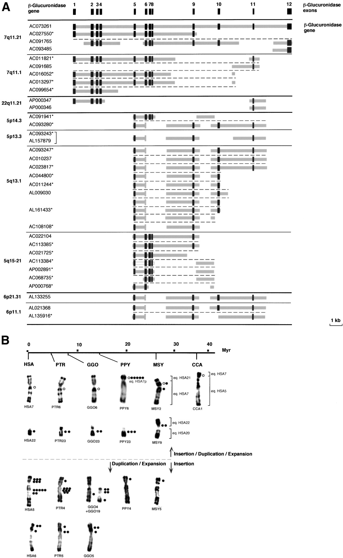 (A) Schematic representation of the genomic structure of the β-glucuronidase gene (GUSB) and GUSB-derived paralogous sequences. The genomic structure of the GUSB gene was established according to sequence comparison and alignment between the β-glucuronidase mRNA complete sequence (M15182) and genomic sequence of the BAC clone RP11-252P18 (AC073261). Dark gray boxes indicate the exons, and thick light-gray lines indicate intervening intronic sequences. For each GUSB-derived sequence found in the draft sequence of the human genome, the chromosomal localization and the GeneBank ID of the clone(s) they were derived from are indicated. (*) Clones in HTGS phase in GenBank—according to the June 2002 freeze of the genome draft sequence. Horizontal black bold lines illustrate chromosomal separations, horizontal black plain lines, subchromosomal separations, and horizontal black broken lines, gene-copy separations. The bracket indicates that the same clone was sequenced twice. (B) Summary of the in situ hybridization results obtained with a Glu 5–10 cosmid probe on human (HSA) and other primate chromosomes. A molecular timescale for primate evolution is indicated. The number of dots indicates the average signal intensity observed at a given location, resulting from the number of loci and the hybridization efficiency. The brackets illustrate the homologies between Macaca or Cebus and human chromosomes. In the presumed ancestral karyotype of placental mammals, the HSA7 homolog was composed of two parts. These two components fused before the separation of Cercopithecoidea and Hominidae (∼25 Mya), and then pericentric and paracentric inversions occurred in theHominidae lineage. Thus, HSA7 is a fairly recent chromosome shared by HSA and PTR only. In Cebus capucinus, the smallest part homolog to HSA7 is on CCA1 associated with the homolog to the whole HSA5 (Richard et al. 1996). In Macaca sylvana, MSY2 is formed by the equivalents of the whole HSA7 and HSA21, and MSY9 by the equivalents of HSA20 and HSA22 (Muleris et al. 1984). HSA22/PTR23/GGO23/PPY23 on one hand, and HSA6/PTR5/GGO5 on the other hand, differ mostly only by heterochromatic variations (Yunis and Prakash 1982). The differences in the chronology of expansion/spreading of the GUSB paralogous sequences is depicted by a horizontal broken line, top, primo-insertion in pericentromeric regions on ancestral HSA7 and HSA22, bottom, primo-insertion in the ancestral HSA5p euchromatic region.
