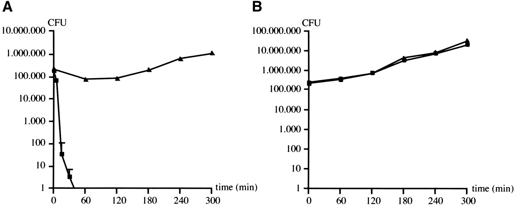 Survival of N. meningitidis 8013 (triangles) and an isogenic unencapsulated mutant (squares) in native (A) and heat-inactivated serum (B). Error bars indicate standard errors of the means (n = 4).