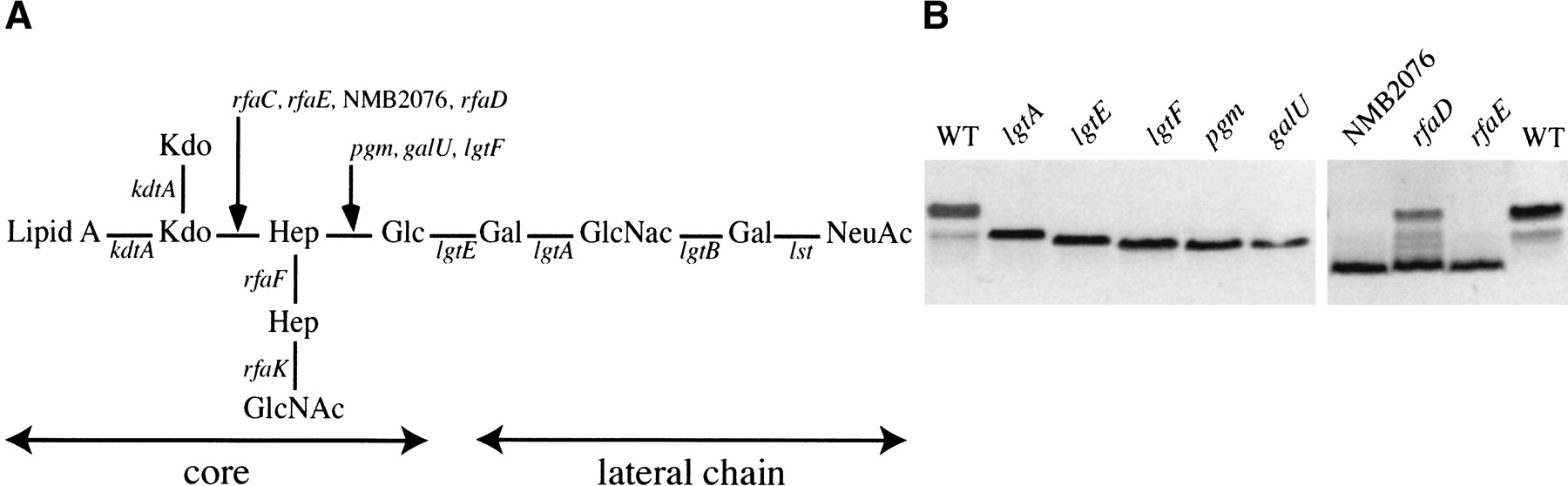 Functional analysis of LOS mutants. (A) Representation ofN. meningitidis 8013 LOS. (B) Silver-stained SDS-PAGE of LOS preparations with wild-type (WT) included as a control.
