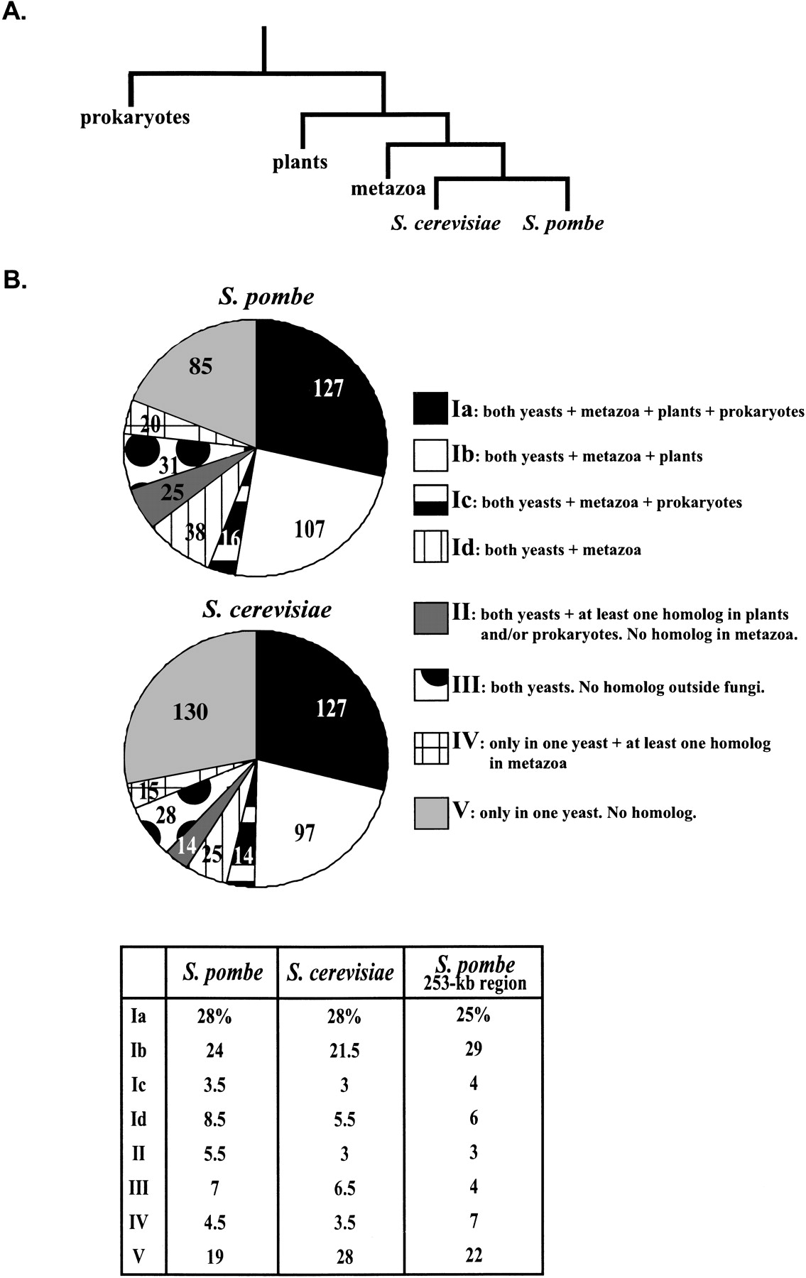 Comparison of S. pombe and S. cerevisiae proteome. (A) A consensus phylogeny of fission yeast and budding yeast adapted from Sipiczki (2000). (B) 450 proteins from S. pombe and S. cerevisiae (YPD and PombePD) were compared to proteins from prokaryotes, metazoa, plants, S. pombe, andS. cerevisiae using BLASTP (Altschul and Lipman 1990) with a cutoff E value of 10−5. The proteins from both yeasts were classified into eight different classes, according to the distribution of homologous proteins in other species. Class I: homologous proteins are found in both S. pombe and S. cerevisiae and in either metazoa + plants + prokaryotes (Ia), or metazoa + plants with no homolog in prokaryotes (Ib), or metazoa + prokaryotes (Ic), or only metazoa (Id). Class II: homologous proteins are found in both yeasts and in plants or prokaryotes, but there is no homolog in metazoa. Class III: homologous proteins are present in both S. cerevisiae and S. pombe, but there is no homolog outside the fungal branch. Class IV: homologous proteins of S. pombe are not found in S. cerevisae and S. cerevisiae proteins do not have an homolog in S. pombe, but homologous proteins of both yeasts are found at least in the metazoa branch. Class V: there is no homologous protein of one yeast in the other yeast, and no homolog in other branches. Numbers of genes in each category are shown for both yeasts. Percentages are given in the table. The third column gives the gene distribution in the 253-kb region that we selected for systematic gene deletion in this study.