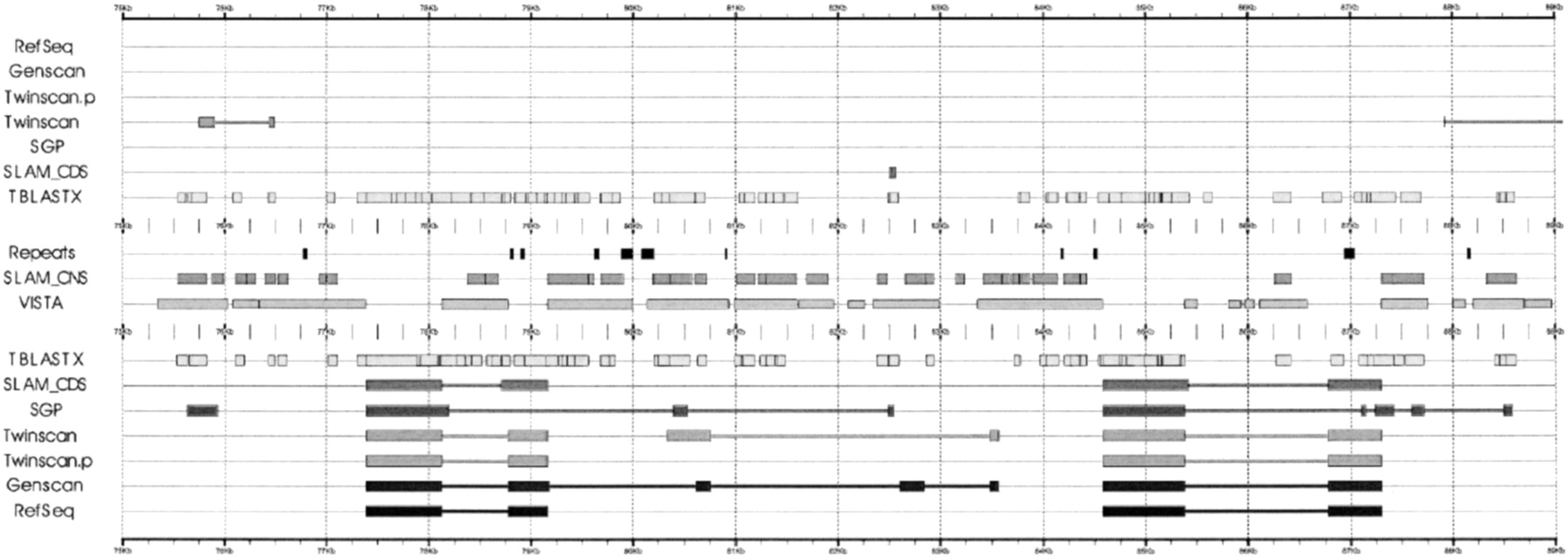 Fourteen thousand bp from the HoxA cluster showing the HoxA2 and HoxA3 genes. The top half of the figure consists of predictions and annotations for the 5′ → 3′ strand and the bottom half for the 3′ → 5′ strand. The tracks shown are: RefSeq annotations, GENSCAN, TWINSCAN, SGP-2, and SLAM predictions, Repeats masked by RepeatMasker (A. Smit and P. Green, unpubl.), TBLASTX alignments, and SLAM and VISTA CNS annotations. The figure was created using gff2ps by J.F. Abril and R. Guigó, available athttp://www1.imim.es/software/gfftools/GFF2PS.html.