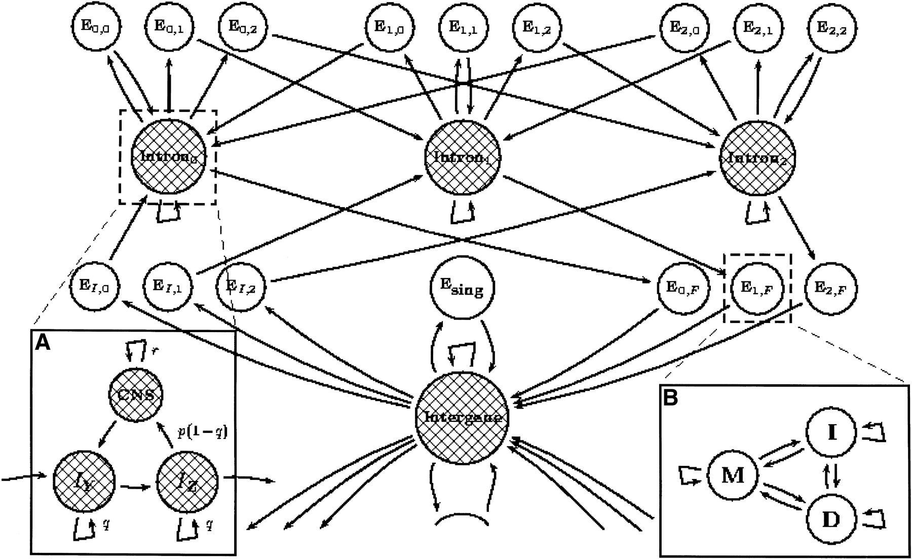 A GPHMM for alignment and prediction of exons using genomic DNA from two different organisms. The shaded states are the typically less-conserved intergene and intron states, each producing either a single base or a gap in each organism. The use of self-transitions models their state durations as geometric. The unshaded states (all of which are exons) will all have duration 1, as they have no self-transitions; however, they are generalized and produce exon pairs according to some predetermined joint distribution. (A) In order to avoid the prediction of coding exons in all conserved regions, it was necessary to introduce conserved noncoding states (CNS). Each intron and intergene state consist of two parts: an I-state for modeling long unrelated noncoding regions, and a CNS state for modeling interspersed conserved domains. (B) The modeling of coding exon states in pairs required the construction of a specialized PHMM, consisting of match/mismatch (M), insertion (I), and deletion states (D), which was used to assign probabilities to exon pairs based on alignments in protein space using an appropriate evolutionary model.