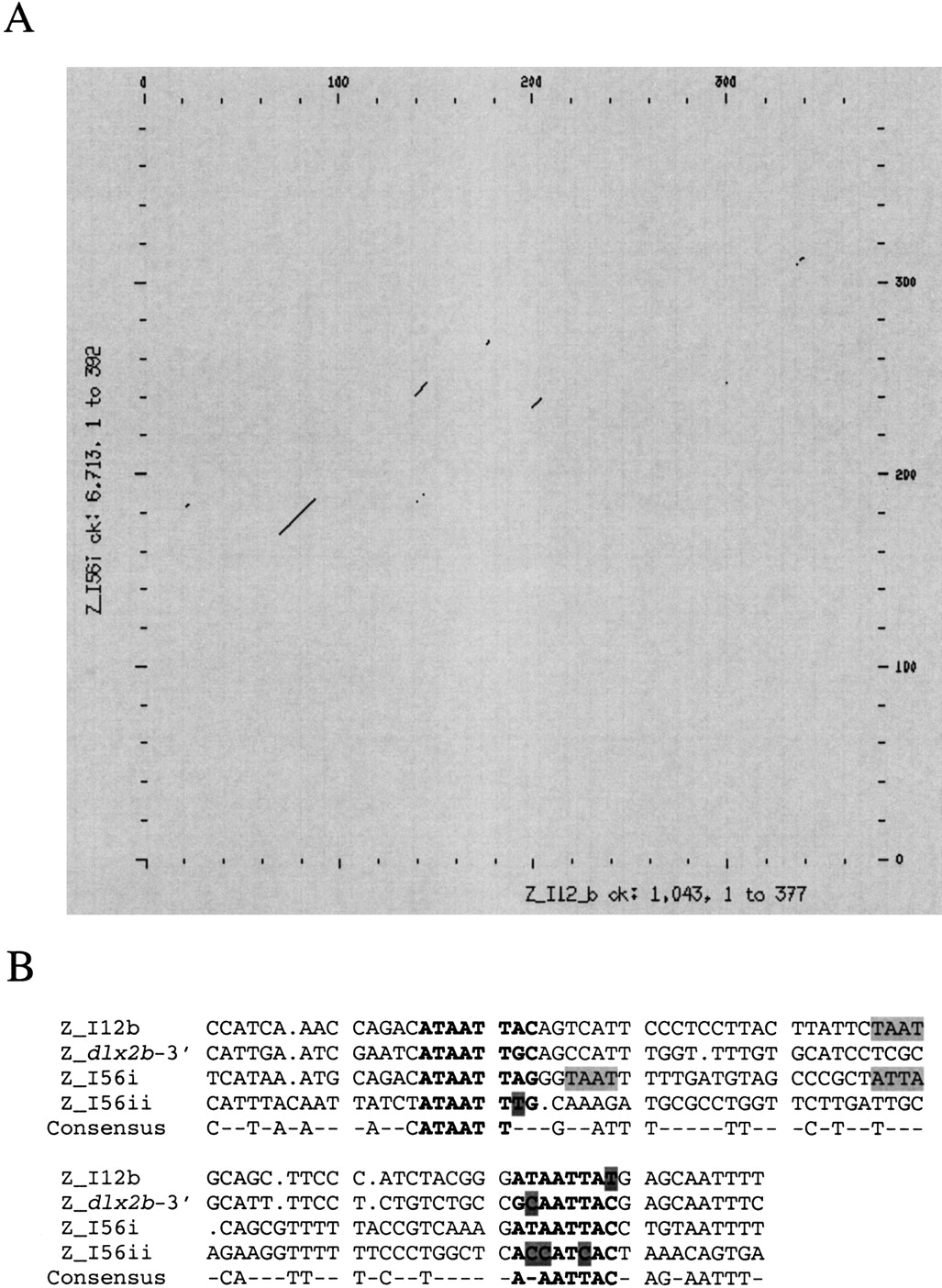 Limited similarity between intergenic forebrain enhancer sequences. (A) Dot matrix comparison of the zebrafish I12b and I56i. The main two regions of sequence similarity are shown in B as multiple sequence alignments between I12b, I56i, and I56ii, and a sequence downstream of the zebrafish dlx2b. A three out of four consensus is shown. Putative Dlx binding sites, (A/C/G/) TAATT (G/A) (C/G), are indicated in bold, with mismatches highlighted. Additional TAAT/ATTA core homeodomain protein-binding sites are also highlighted.