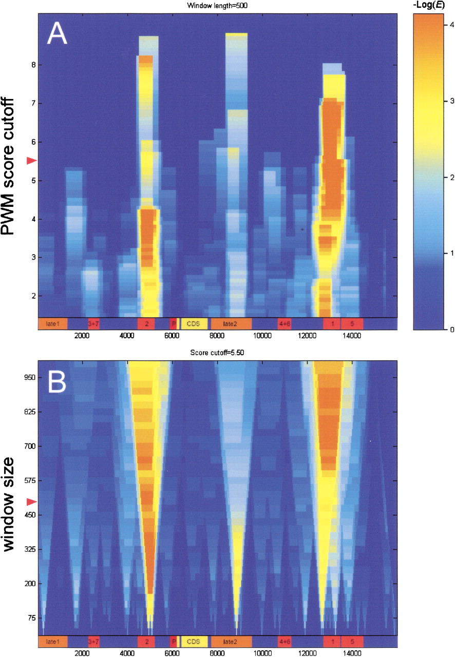 Representation of clustered recognition motifs. The distribution of clusters for the Bicoid motif in the locus of even-skipped is shown. The color intensity scale represents statistical significance of constitutive clusters. A map of known functional elements in theeve locus is given on the bottom of each panel (X-axis: relative position in the locus in base pairs). (A) Dependence of the cluster significance on the PWM site score cutoff (Y-axis) at the fixed window size (500 bp, see also the red mark on B). (B) How the size of the resolution window (Y-axis) affects the cluster significance at the fixed PWM cutoff (red mark on A). The representation given shows that Bicoid clusters in eve stripe 2 and eve stripe 1+5 regions have distinct ratios of high- and low-affinity binding sites (the cluster composition). Both of these regions in the evelocus have been shown to be responsible for formation of correspondingeve expression stripes in a fly embryo. The weak ‘Bicoid’ cluster inside the eve late1 element indicates the presence of the clustered motif related, but not identical to Bicoid. It is known, however, that the eve late2 region is under control of other homeodomain proteins (such as Eve itself) that also have the conserved core consensus sequence TAAT. The best correlation obtained for Bicoid clusters with their cognate CRMs is 0.76 for the eve locus (Table 2, eve locus vs. Bicoid motif).