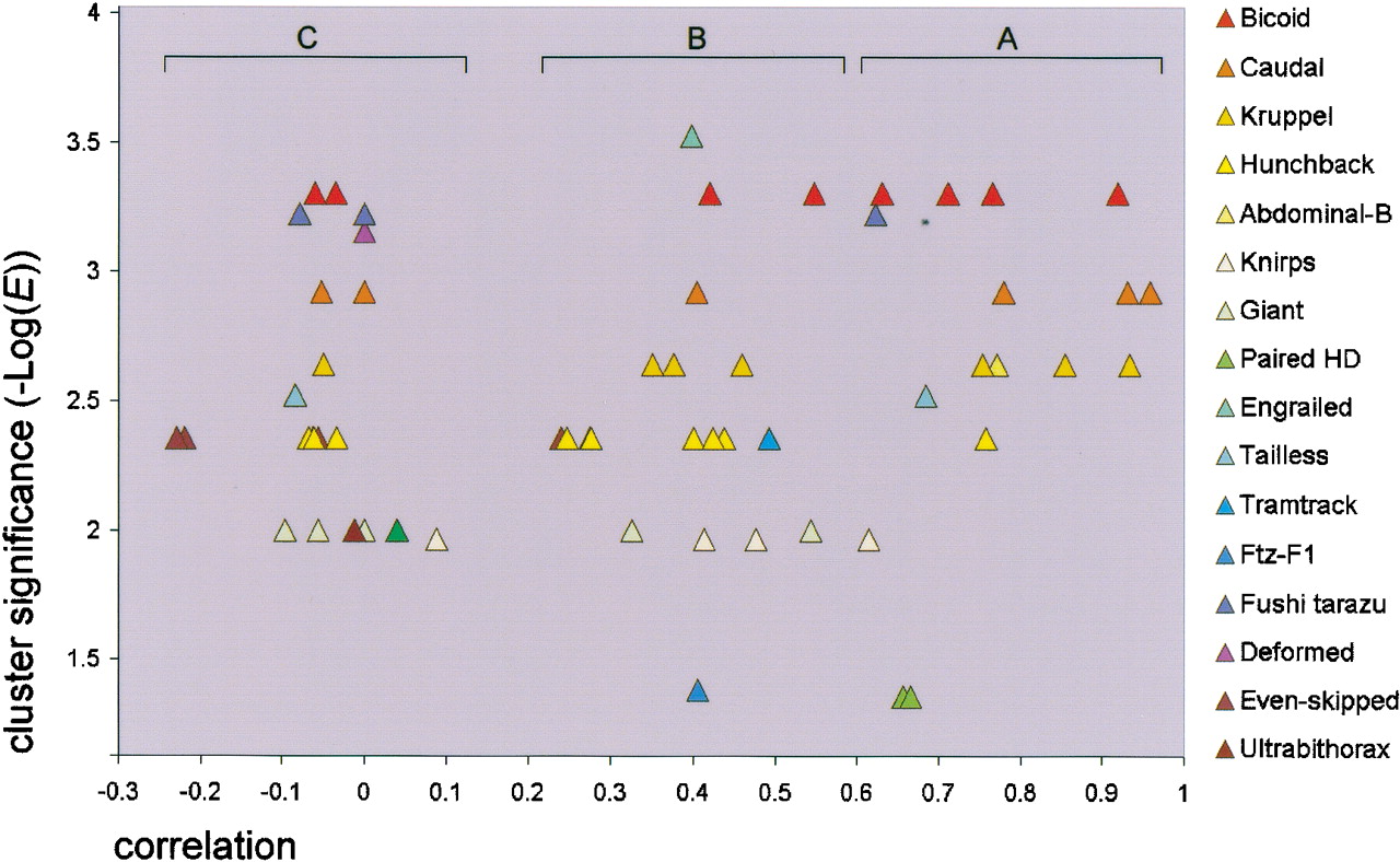 Recognition of known regulatory interactions. The data from Table2 are represented as a scatter plot. The correlation values (X-axis) for tested motif/gene locus combinations are plotted vs. the cluster significance (-Log[E], Y-axis). Motifs are shown on the right side; data points for each motif have the same color. Brackets (A–C) mark three distinct correlation groups. The cluster significance cutoff (the cluster E-value cutoff) was set for each motif on the basis of a global training procedure (see Table 1). Data points in the upper right corner correspond to the best confidence of recognition; poorly performing motifs have a consistently low E-value (Gt, Eve).