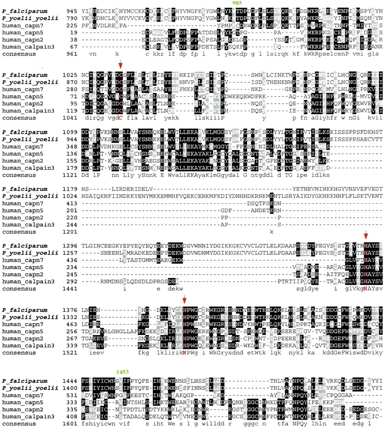 Multiple alignment of the catalytic domains of the putative P. falciparum calpain (MAL13P1.310) and the representative human calpains using T-coffee program followed by manual correction. The catalytic domain region is predicted to be from amino acid residue 985 to 1453 by pfam HMM algorithm. The three conserved amino acids, C(1035), H(1371), N(1391), that are part of the active sites are highlighted with arrowheads. Graphic presentation of the alignment and the consensus sequence were obtained by the program BOXSHADE 3.21. Conserved residues are shaded with black and gray. The accession numbers of calpain protein sequences used for alignment refer to Figure2.