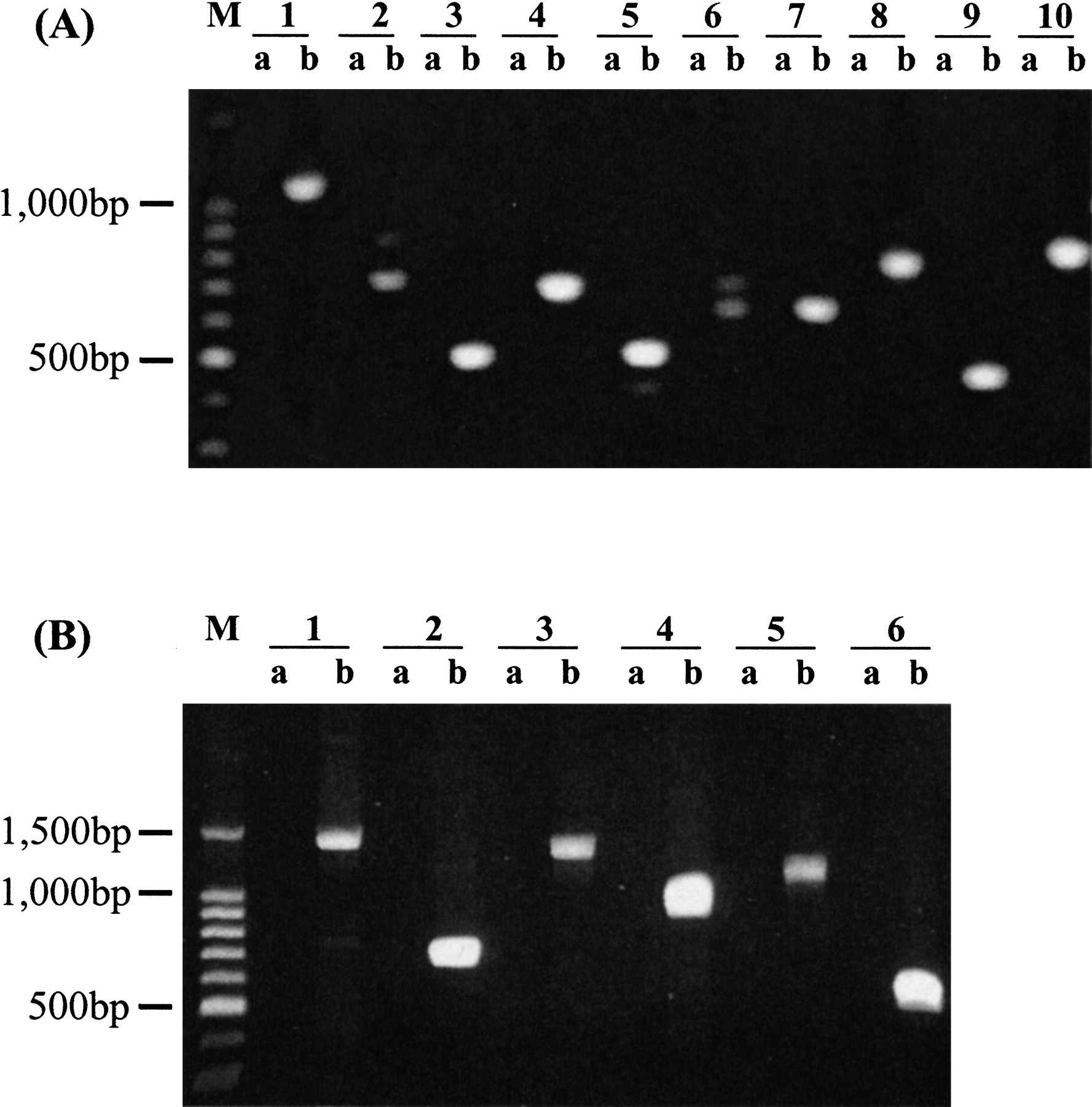 (A) Expression of ten putative proteases without corresponding oligomers in the microarray set. RT-PCR was conducted to examine the transcriptional expression of the ten putative proteases using specific primers based on the prediction. Lane a in each sample represents the negative control in which RT-PCR was conducted without reverse transcriptase. Lane 1b: PF14_0281; Lane2b: PFL1635w; Lane 3b: MAL6P1.153; Lane 4b: PFL1925w; Lane 5b: PFC0950C; Lane 6b: MAL8P1.16; Lane7b: MAL6P1.88; Lane 8b: MAL8P1.128; Lane 9b: PFA0400c; Lane 10b: PFI1545c.M indicates 1 kb DNA ladder. (B) Expression of putative calpain, caspase, and SP1 genes using two pairs of primers. RT-PCR was conducted to confirm the transcriptional expression of putative calpain, metacaspase, and SP-1 genes, using 2 pairs of specific primers for each gene. Lanes “a” represent negative controls in which RT-PCR was conducted without reverse transcriptase.M indicates 1 kb DNA ladder. Lanes1b and 2b: MAL13P1.310; Lanes 3b and4b: PF13_0289; Lanes 5b and 6b: PF13_0118. See Suppl. Table 1 for the predicted size of RT-PCR products.