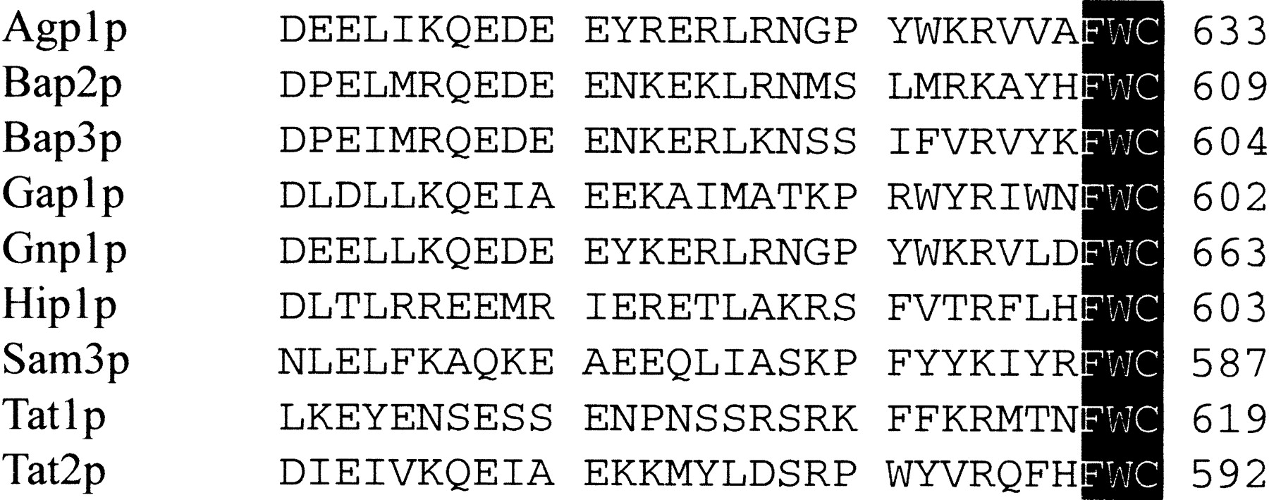 Alignment of the amino acid sequences of the nine amino acid permeases from S. cerevisiae that end in the tripeptide FWC (highlighted) across the C-terminal 30 residues. Note that there are no other absolutely conserved residues within this region besides the terminal tripeptide.