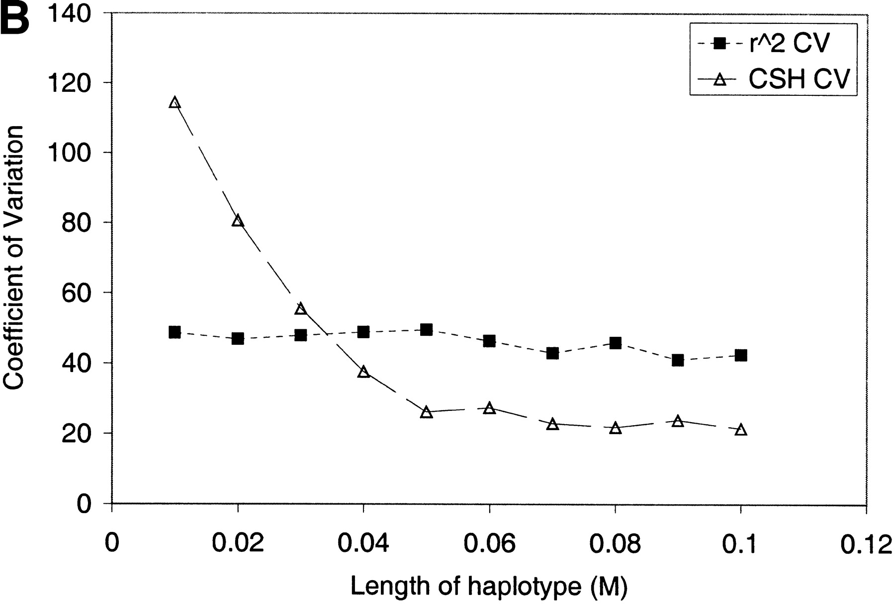 (A) CSH and r 2 from the simulated data set. Results are averaged over all haplotype regions of a given length, and over 200 replicates. (B) Coefficient of variation ofr 2 and CSH over all haplotype regions of the same length, across 200 replicates. (C) CSH from the data simulated with either an infinite alleles model or a stepwise mutation model. Results are averaged over all haplotype regions of a given length, and over 200 replicates.