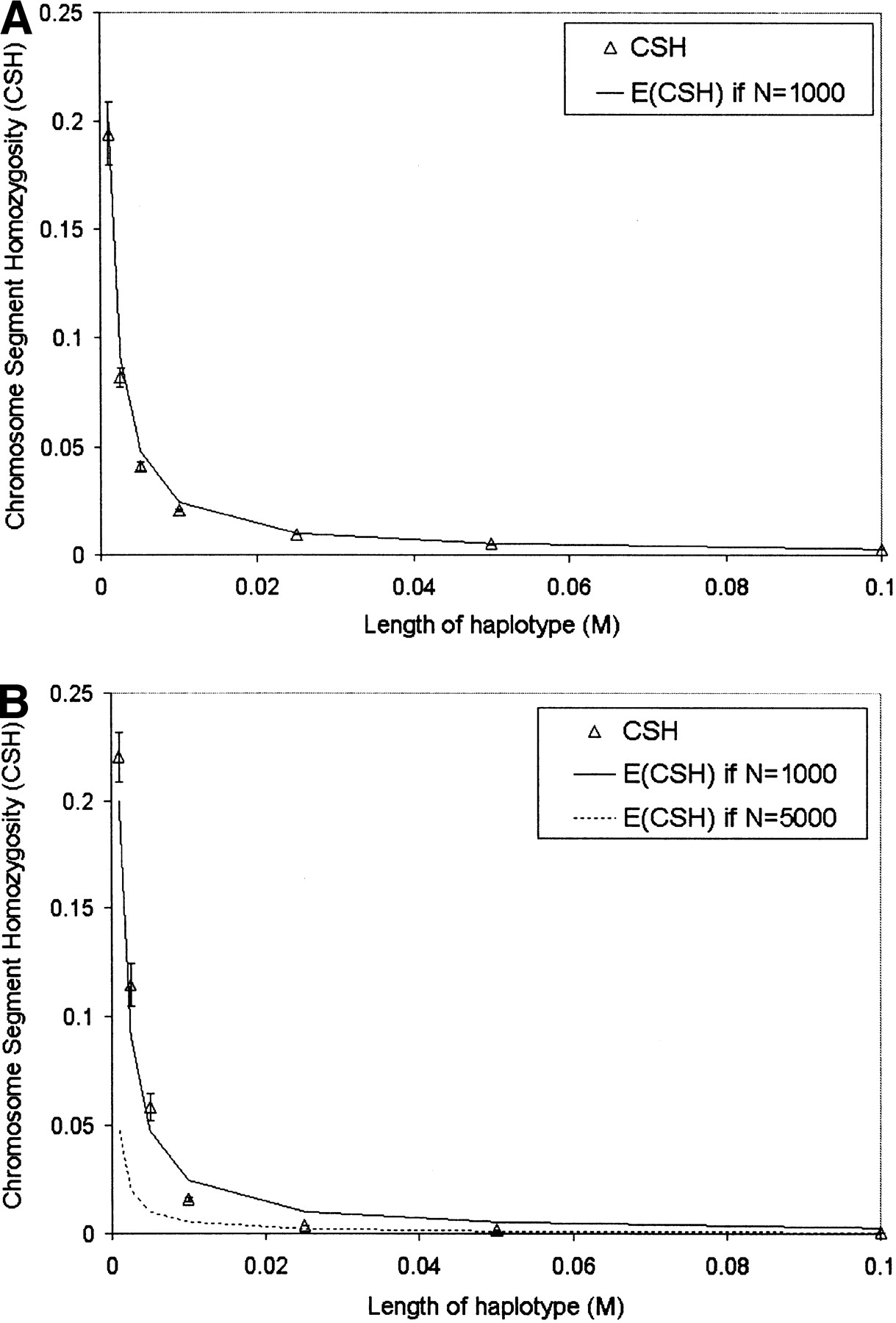 Chromosomal homozygosity for different lengths of chromosome (given the recombination rate) for populations: (A) CONS (constant population size), (B) LINI (linearly increasing population size), (C) LIND (linearly decreasing population size), and (D) EXPI (exponentially increasing population size). The expected value of chromosomal homozygosity, 1/(4Nc + 1), is given on each graph for the maximum and minimum population sizes of each population. Standard error bars indicate variation among the 50 replicates.