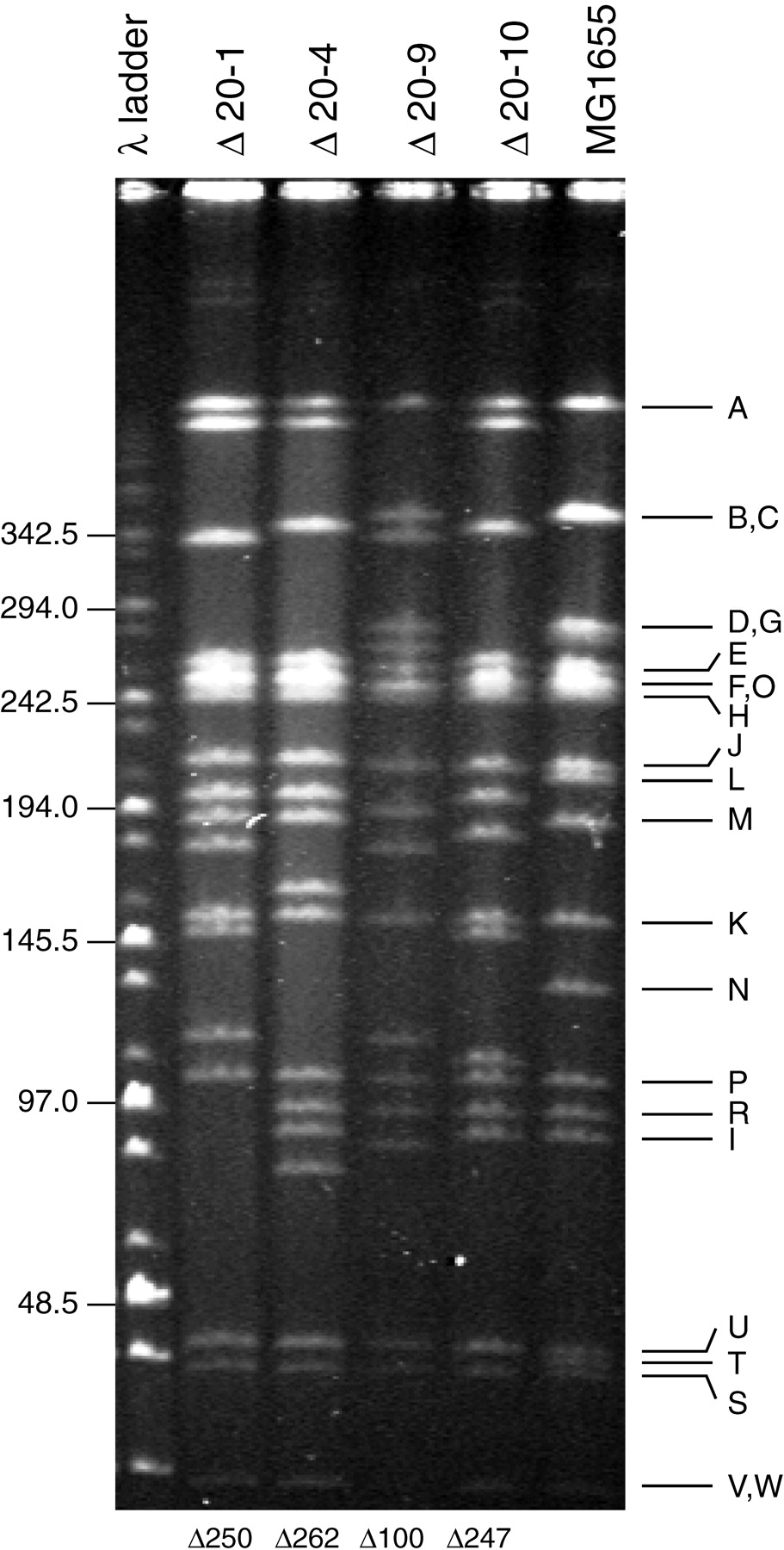 Pulsed-field gel electrophoretic analysis of MG1655 deletion derivatives after 20 rounds of transposition and deletion. Transpositional deletion of chromosomal DNA was performed recursively for a total of 20 cycles. After these 20 cycles, chromosomal DNA was prepared from 4 deletion strains as well as the initial strain MG1655. The chromosomal DNA was digested to completion with NotI restriction endonuclease and analyzed by pulsed-field gel electrophoresis. Visualization by ethidium bromide staining and UV irradiation revealed the pattern of DNA bands. The pattern for MG1655 matches that reported previously (Heath et al. 1992), and the identification letter for each fragment is shown at right. For each of the deletion strains, the pattern is altered and indicates a loss of DNA. The size of each new band in the four deletion strains was estimated by comparison with DNA markers. The estimation for total amount of deleted DNA in each of the strains is shown atbottom.