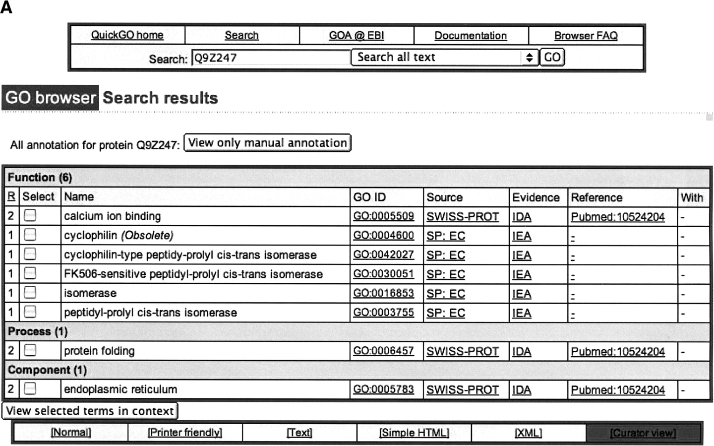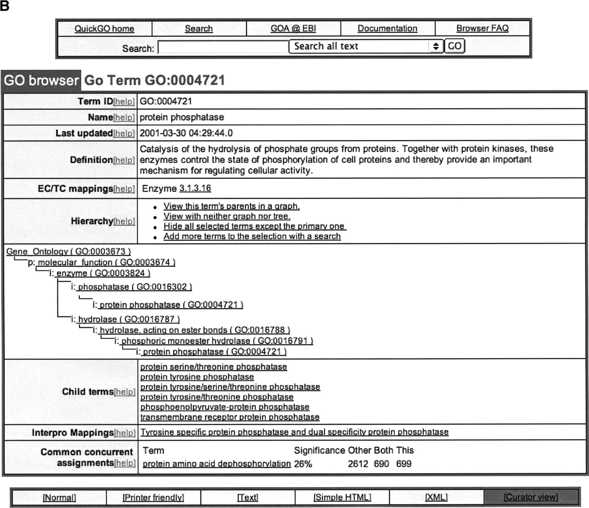(A) Sample of QuickGO display page showing all GO terms that have been mapped electronically and manually to SWISS-PROT entry Q9Z247. (B) Sample of QuickGO display screen showing all information currently available through EBI for the GO term “protein phosphatase,” using the denormalized tree view. (C) Sample of QuickGO display screen showing all information currently available through EBI for the GO term “protein phosphatase,” using the graphical tree view.