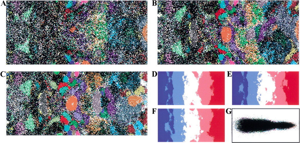 SOMs for 1-kb sequences of 65 bacterial genomes. (A,B,C) Di-, tri-, and tetra-SOMs, respectively. Lattices are colored as described in Fig. 1,A–C. (D,E,F) G+C% for each weight vector is shown as described in Fig. 1, D–F. (G) Classification by the initial weight vectors for the di-SOM.