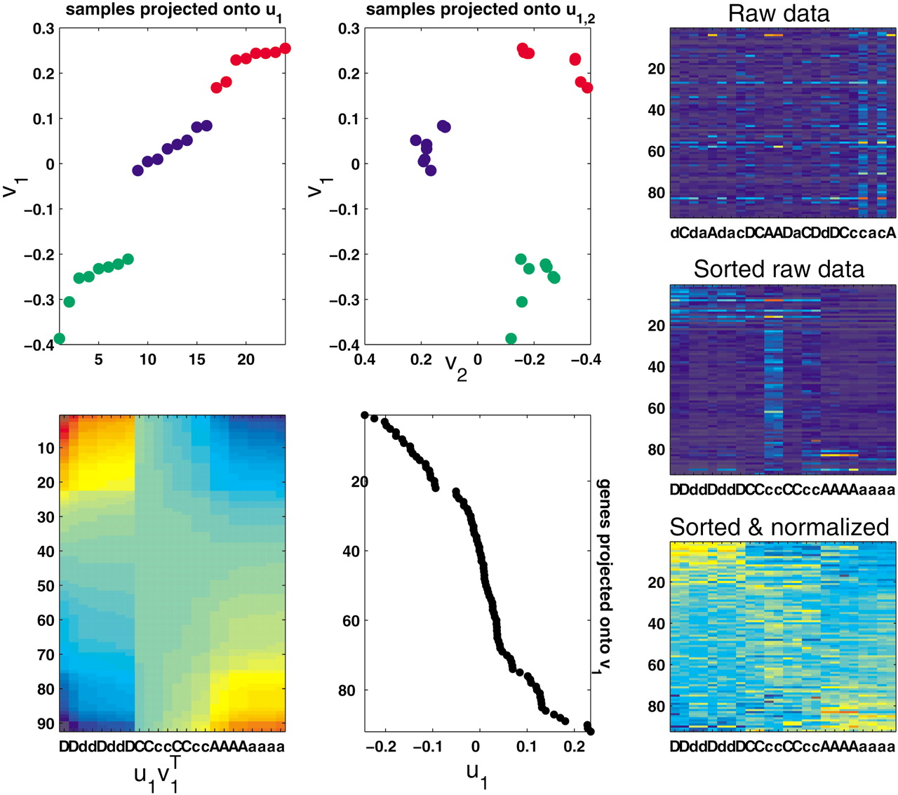 Optimal array partitioning obtained by the 1st singular vectors of the log-interaction matrix. The data consist of eight measurements of mRNA ratios for three pairs of cell types: (A,a) benign breast cells and the wild-type cells transfected with the CSF1R oncogene causing them to invade and metastasize; (C,c) cells transfected with a mutated oncogene causing an invasive phenotype and cells transfected with the wild-type oncogene; and (D,d) cells transfected with a mutated oncogene causing a metastatic phenotype and cells transfected with the wild-type oncogene. In this case we preselected differentially expressed genes such that for at least one pair of samples, the genes had a threefold ratio. The sorted eigen-gene v1 and eigen-arrayu1 have gaps indicating partitioning of patients and genes, respectively. As a result, the outer product matrix sort(u1 ) sort(v1 )T has a “soft” block structure. The block structure is hardly seen when the raw data are sorted but not normalized. However, it is more noticeable when the data are both sorted and normalized. Also shown are the conditions projected onto the first two partitioning eigenvectors u1 and u2. Obviously, using the extra dimension gives a clearer separation.