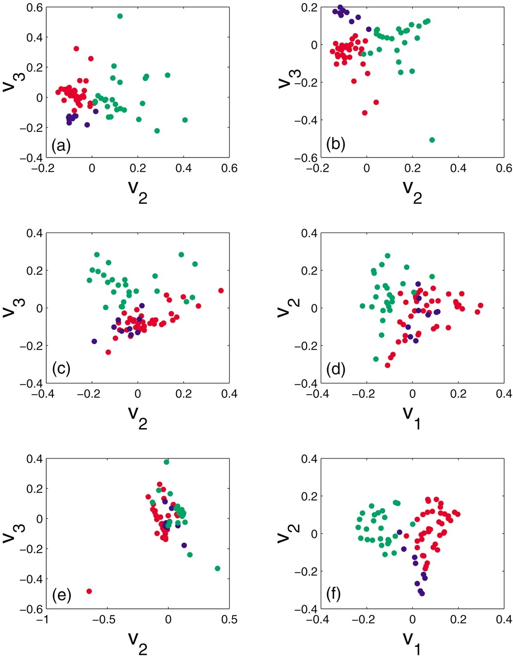 Leukemia data presented in the same format as in Fig. 3. B-cell ALL samples are denoted by red dots, T-cell ALL by blue dots, and AML by green dots. In this analysis we preselected all genes that had positive Affymetrix average difference expression levels.
