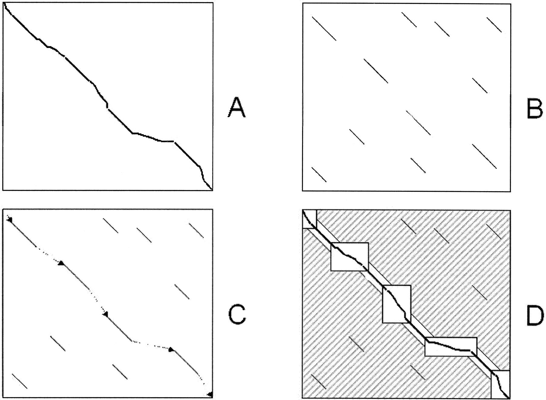 The LAGAN algorithm. (A) A global alignment between two sequences is a path between the top-left and the bottom-right corner of their alignment matrix. (B) LAGAN first finds all local alignments between the two sequences. (C) LAGAN computes a maximal-scoring ordered subset of the alignments, the anchors, and puts together a rough global map. (D) LAGAN limits the search for an optimal alignment to the area included in the boxes and around the anchors, and computes the optimal Needleman-Wunsch alignment limited to that area. LAGAN uses memory proportional to the area of the largest box plus the memory to hold the optimal alignment.