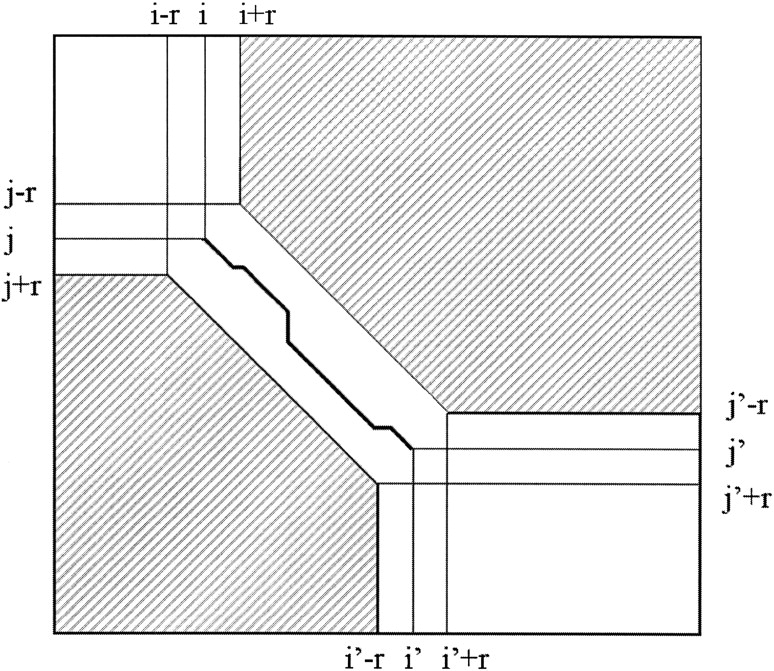Limited area of dynamic programming around an anchor. An anchor between (i, j) and (i‘, j‘) in the rough global alignment limits the search area of Needleman-Wunsch. The alignment is required to pass through the diagonal from (i − r, j + r) to (i + r, j − r), stay within the diagonals from (i − r,j + r) to (i‘ − r,j‘ + r) and from (i + r,j − r) to (i‘ + r,j‘ − r), and exit through the diagonal from (i‘ − r, j‘ + r) to (i‘ + r, j‘ − r).