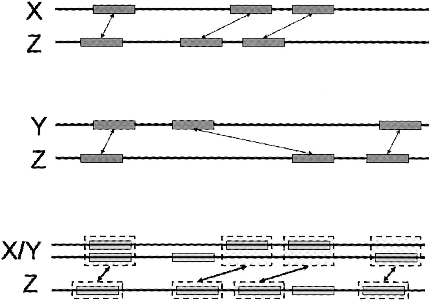 Generation of anchors during progressive alignment. Multi-sequence X/Y is aligned to sequence Z. Anchors between X and Z (top) and anchors between Y and Z (middle) are remapped to coordinates in the X/Y multi-sequence, and given a new score. Then, the Longest Increasing Subsequence algorithm is applied to select a subset of the remapped anchors, as the anchors between X/Y and Z.