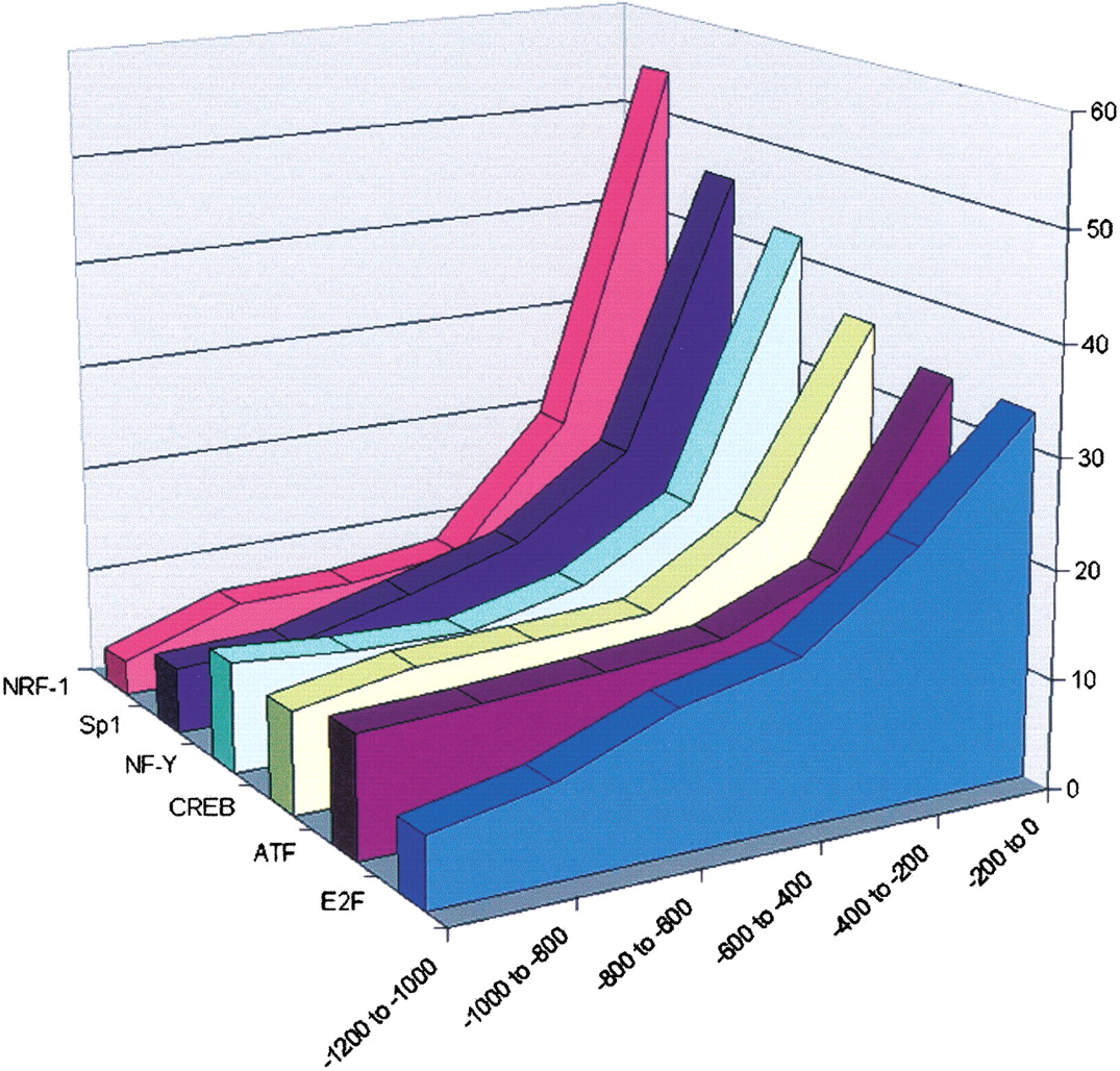 Distribution of locations of TF putative binding sites found in 568 cell-cycle-regulated promoters. Promoters were divided into six intervals, 200 bp each. For each of the PWMs listed in Table 3, the number of times its computationally identified binding sites appeared in each interval was counted (after accounting for the actual number of base pairs scanned in each interval; this number changes as the masked sequences are not uniformly distributed among the six intervals). Locations of NRF-1, CREB, NF-Y, Sp1, ATF, and E2F binding sites tend to concentrate in the vicinity of the TSSs (χ2 test,p < 0.01).
