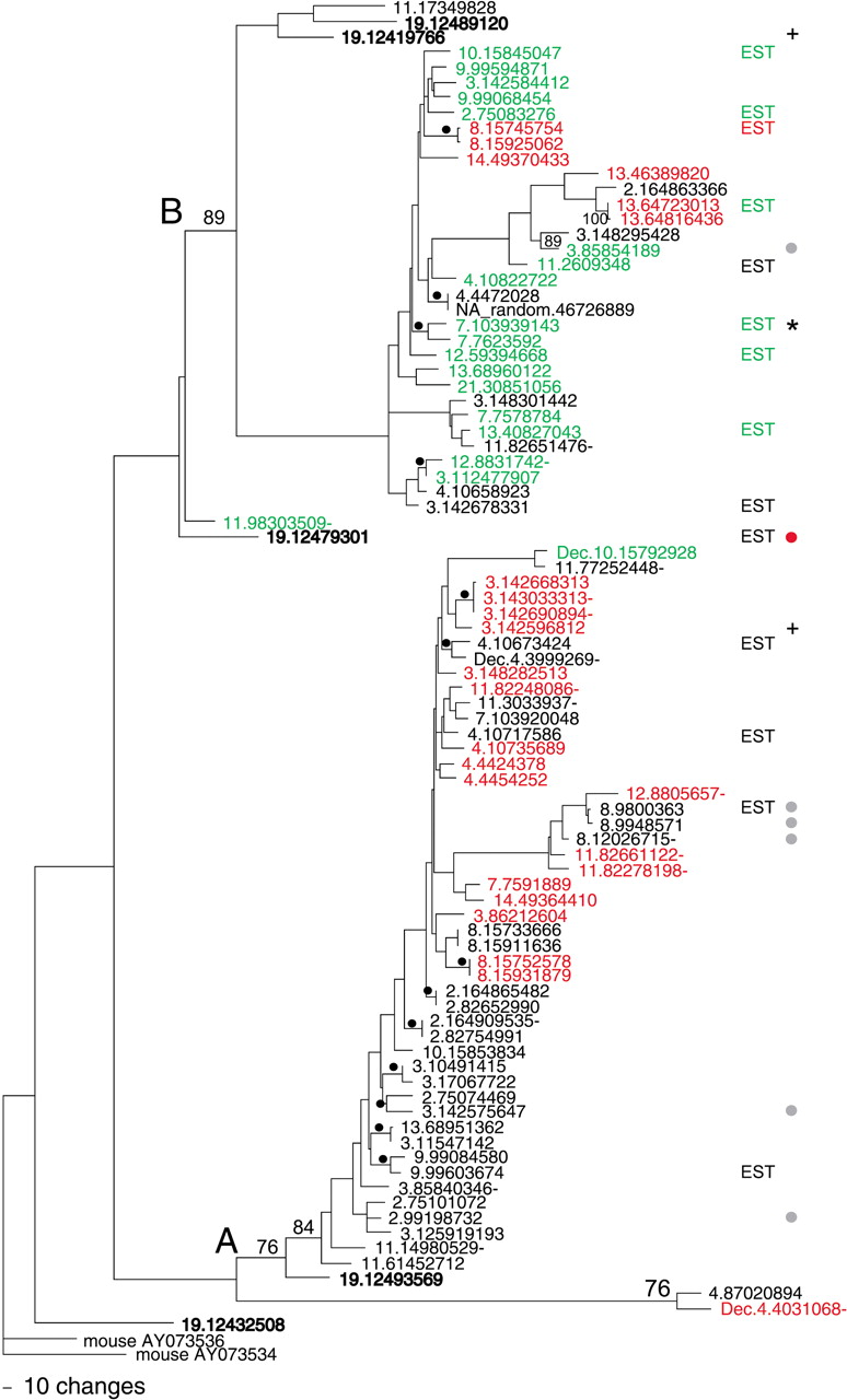 A parsimony tree of the 88 7E nucleotide sequences. The two major clades of the tree are labeled (A) and (B). Bootstrap values (% of 1000 iterations) are indicated when >75% on the major branches and marked with black dots when ≥85% on the minor banches. The 7E genes are labeled by their position in the UCSC August 2001 assembly of human draft sequence (see Methods); Supplementary Table A gives the corresponding names assigned to the genes by Glusman et al. (2000a) and/or in HORDE. We also included in our set of 88 the sequences for three 7E genes that are found in two finished BACs (AL360083 and AC073648) included in later assemblies (these names of these genes carry the prefix Dec). Genes in bold type are those found in the ancestral locus on chromosome 19. Genes with names in red contain a common substitution resulting in a stop codon in TM6, and those in green contain a common frame shift leading to a stop codon in TM3. The gene marked by a red dot encodes an ORF containing seven TM regions and also encodes a methionine at the beginning of the first predicted extracellular region. Genes marked by a gray dot have ORFs that are predicted to encode six TM regions. Genes marked + have a Ks/Ka value ≥5 on average when compared to 75% of the other 7E genes. “EST” designates genes that match (≥98%) human ESTs. “EST*” designates a gene that matches spliced ESTs. Gene names followed by a dash are not part of 7E SDs.