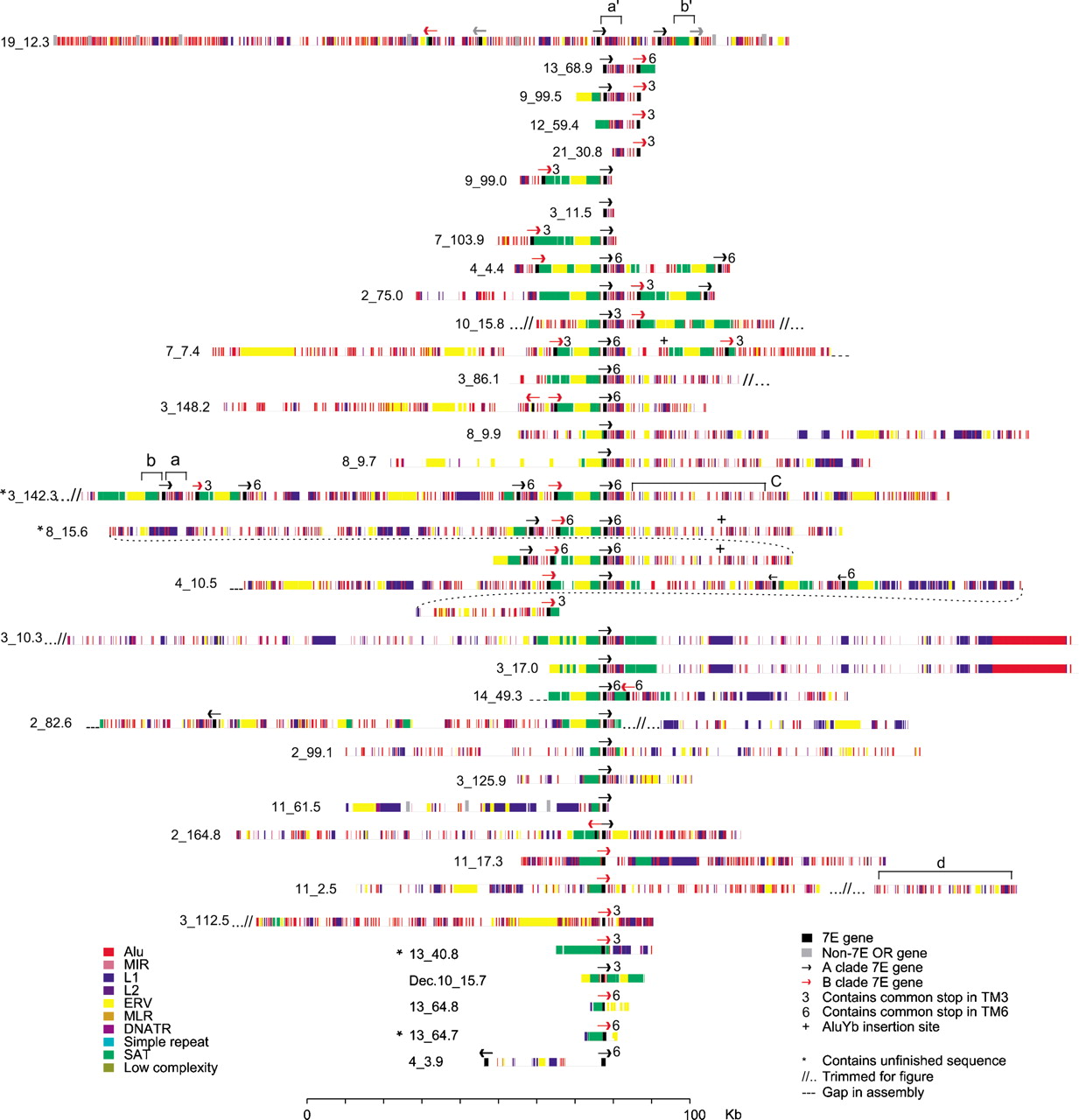 The complex structure of 7E SDs. Each 7E SD is shown with its constituent repeat-element structure (colored bars) around 7E gene(s) (black bars). The arrows, which are not drawn to scale, represent the 5′ to 3′ transcriptional direction of each 7E gene; black and red arrows designate members of clade A and clade B, respectively. The labels to the left of each 7E SD give the chromosome and position in the UCSC August 2001 assembly at which the SD begins. The top line shows the putative ancestral locus on human chromosome 19 and includes non-SD material. The brackets a–d, a‘, and b‘ denote features discussed in the text. The four SDs that include unfinished sequence are marked with asterisks.
