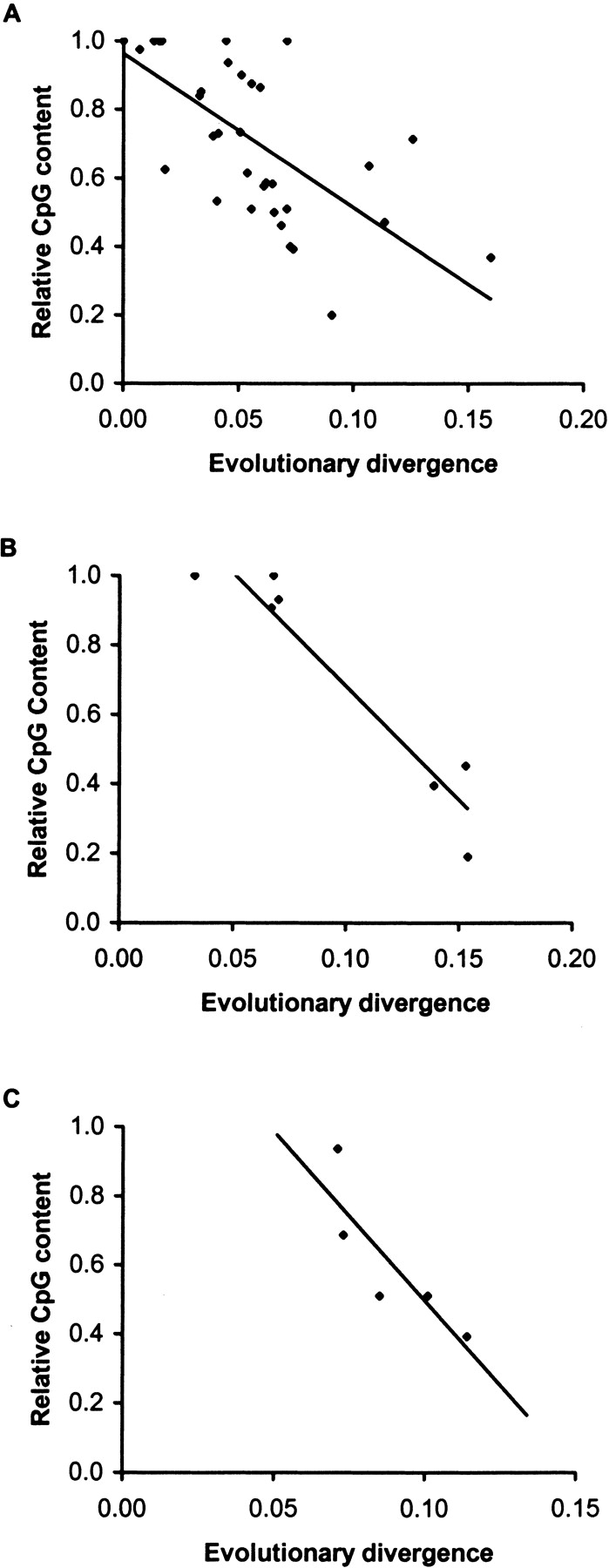 Relationship between evolutionary divergence and the ratio of CpG contents in pseudogenes and their functional counterparts. (A) Analysis of 39 human pseudogenes [R 2 = 0.52;P < 0.01], (B) seven pseudogenes created from the same Arginino succinate synthetase gene [R 2 = 0.90; P < 0.01], and (C) five pseudogenes of the same Beta tubulin Q gene [R 2 = 0.73; P < 0.05]. The relative CpG content is the ratio of the overall CpG content in the pseudogene divided by overall CpG content of the functional gene.