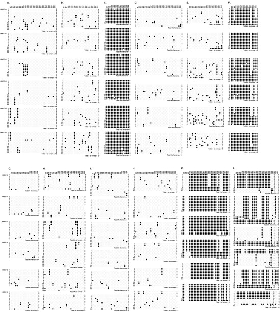 Distribution of unmethylated and methylated CpG sites shown by bisulfite sequencing. Unmethylated and methylated CpG sites are shown by open and closed circles, respectively. (A)–(C) A CGI in the promoter region, a CGI outside the promoter region and CpG sites in non-CGIs of the E-cadherin gene. (D)-(F) A CGI in the promoter region, a CGI outside the promoter region and CpG sites in non-CGIs of the p41-Arcgene. (G), (H) A CGI in the promoter region and a CGI outside the promoter region of the SIM2 gene. (I) A CGI in the promoter region of the 3-OST-2 gene. (J) A CGI in the promoter region of the Cyclophilin A gene. (K) A CGI in the promoter region of the MAGE-A3 gene, which is normally methylated. (L) A CGI in the differentially methylated region of the H19 gene.