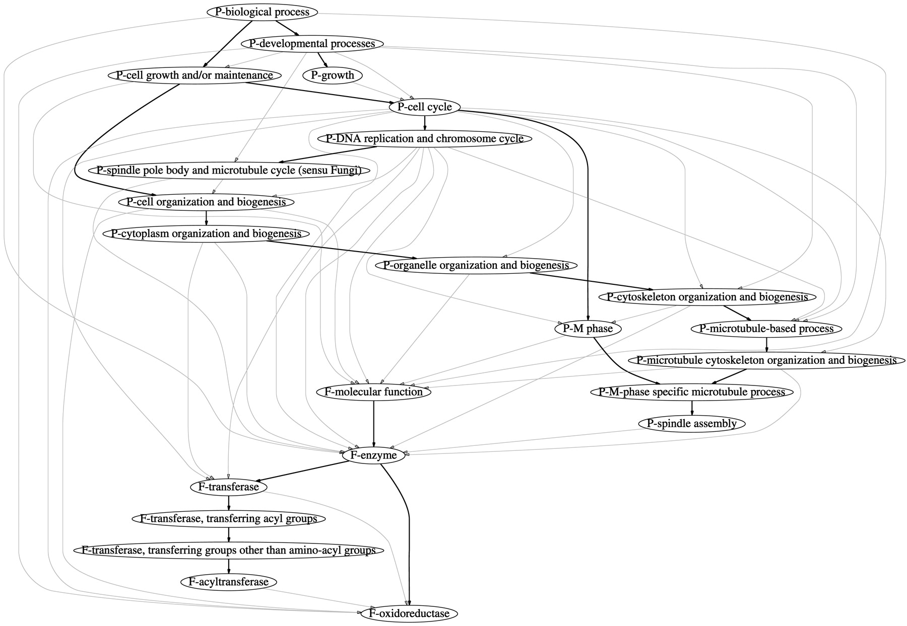 A fragment of the Bayesian network for SGD attributes. The full network contains 634 nodes. There is an edge from Xj toXk if and only ifXj ∈ pa(Xk ). Most of the displayed vertices have additional outgoing edges, not shown, to vertices that are not shown. Edges in the Bayesian network that are also edges in the GO DAG are shown in black; the remaining edges are shown in gray.