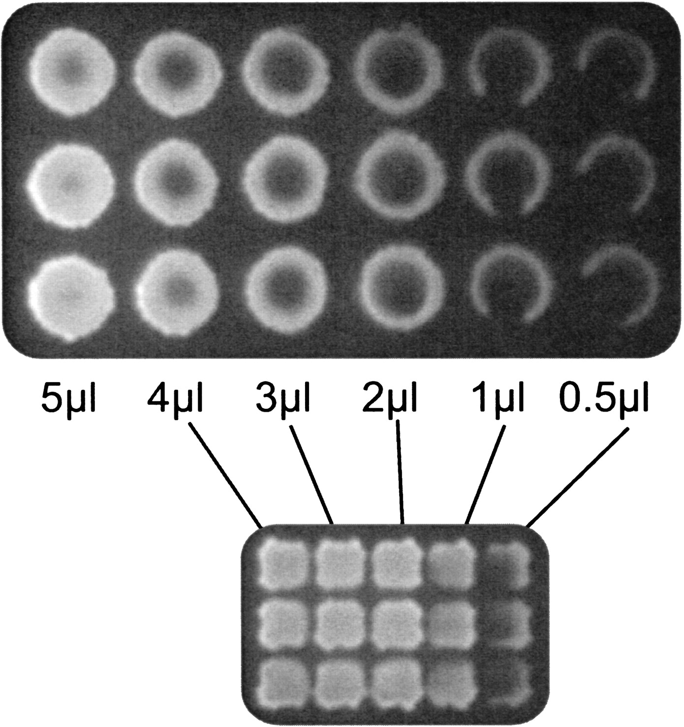 The quality of membrane array features created by centrifugation is shown for different volumes of transfer solution, starting from 384-well plates (top image) and 1536-well plates (bottom image).