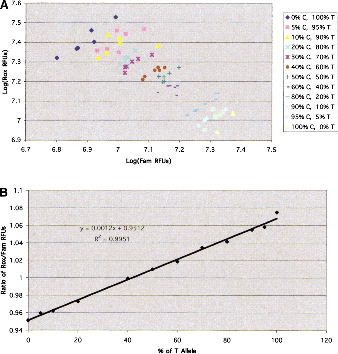 Standards for allele frequency determination. (A) Fluorescence intensity measurements obtained from samples containing known proportions of two alleles (in this case, C and T). Each sample group has N = 6 except 100% C, for which N = 2. (B) Plot of the ratios of Fam and Rox fluorescence intensity measurements against the percentage of T allele in the sample. Linear regression analysis reveals a linear relationship.