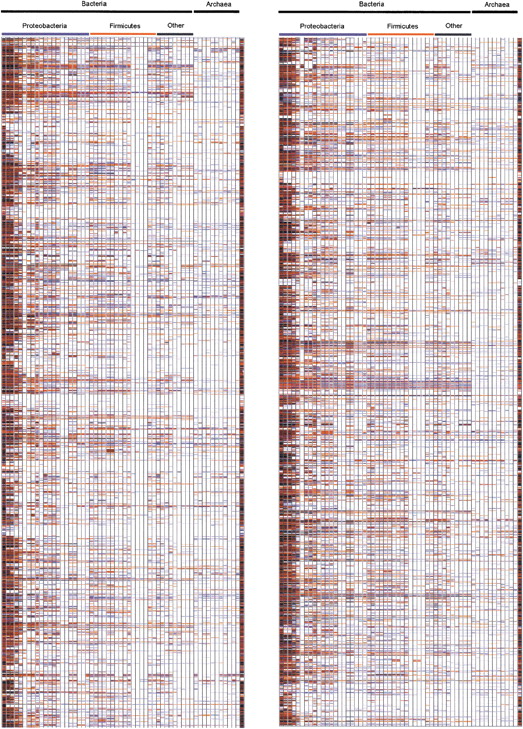 Genome profile of the Escherichia coli K12 genome against the genomes listed in Table 1. The last genome on theright part of the figure is E. coli O157 again to serve as reference. The Genome Conservation Profile was obtained comparing each protein encoded by the genome of E. coli K12 to each of the databases of all proteins for each organism listed in Table 1. Comparisons were done using the NCBI's BLAST2 for a fast identification of homologous sequences. For each protein of theE. coli K12 genome, we obtain a vector whose components can be either the absence of hit, or the e value of the best hit obtained for a given gene. These values are color coded, and the genomes are arranged following the NCBI taxonomy. This is the picture we obtained. Color codes range from black e = 0.0 to pale blue e = 10−10. The darker the color, the more homologous the genes are with respect to the E. colicounterparts. A full color figure can be seen in the additional information Web page http://bioinfo.cnio.es/data/GenomeProfile/.