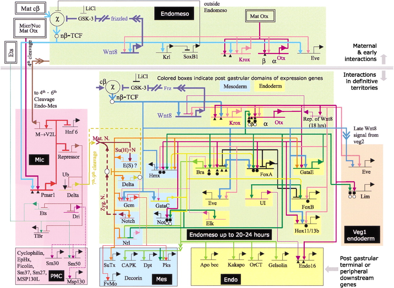 Hierarchical network of gene regulation involved in the specification of endoderm and mesoderm during early sea urchin development (Reprinted with permission from Davidson et al. 2002. Copyright 2002 American Association for the Advancement of Science.). Beginning with the detailed analysis of the cis-regulatory elements flanking a single gene involved in this process, endo16, as well as various trans-acting factors involved in the regulation of endo16, a network of genes and their levels of mRNA expression were studied. Regulatory interactions were determined by antisense oligo inhibition, injection of mRNAs into the embryo, and other perturbation methods. The network depicted in the diagram is based on modeling the various empirical parameters, including the experimental effects in embryos, using a computational environment on the basis of principles used to model mixed analog-digital circuits in the microelectronics industry. For details, see Brown et al. (2002). This envisioned network is but one example of how systems biology is conceptually impacting the field of gene expression. This figure also conveys how challenging it would be at the present time to relate the depicted gene regulatory circuits in relation to nuclear organization.