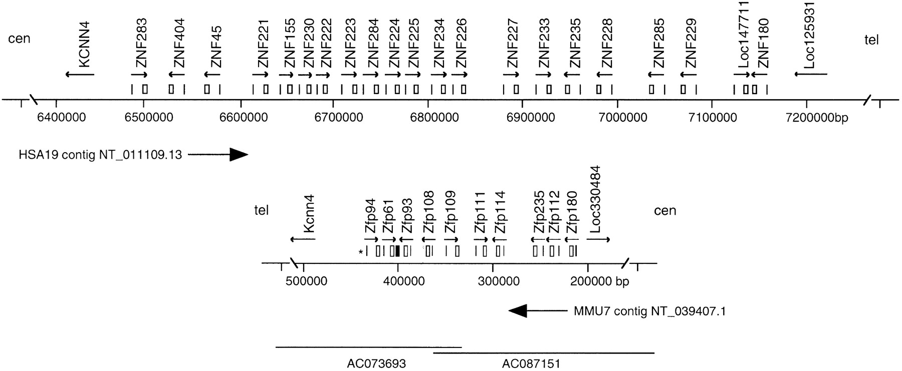 Maps of the homologous human and mouse ZNF gene family regions. Positions of KRAB-A- (vertical lines) and ZNF-encoding exons (boxes) that comprise gene models for 21 human and 10 mouse ZNF genes, as designated by arrows over the corresponding exons indicating transcriptional direction, are drawn above maps of relevant portions of HSA19q13.2 sequence contig NT_011109.13 (top) and Mmu7 contig NT_039407.1 (bottom). Locations of flanking markers KCNN4 and human LOC125931 (mouse LOC330484) are also shown. Numbers below each map correspond to nucleotide positions in the sequenced contig. The regions surrounding mouse and human gene clusters are inverted in telomeric-centromeric orientation due to an ancient chromosome rearrangement event, as indicated by symbols “tel” and “cen” above each map. To align homologous genes, we therefore display the reverse complement of the mouse contig sequence (as indicated by arrow below the mouse map). Conflicts between the NT_039407.1 sequence assembly and cDNA sequences were resolved by examining draft sequence from two overlapping BACs, the approximate extent of which is illustrated by lines drawn at the bottom of the mouse map. Associated numbers correspond to GenBank accession numbers for the BAC sequences. In addition to 10 complete genes, the mouse region contains an isolated ZNF-like segment without a significant ORF (filled box, at positions 407113–407607 at the 3′ end of Zfp61) and a single isolated KRAB-A sequence that is not associated with a known gene (positions 442889–443028 on NT_039407.1, indicated by an asterisk).