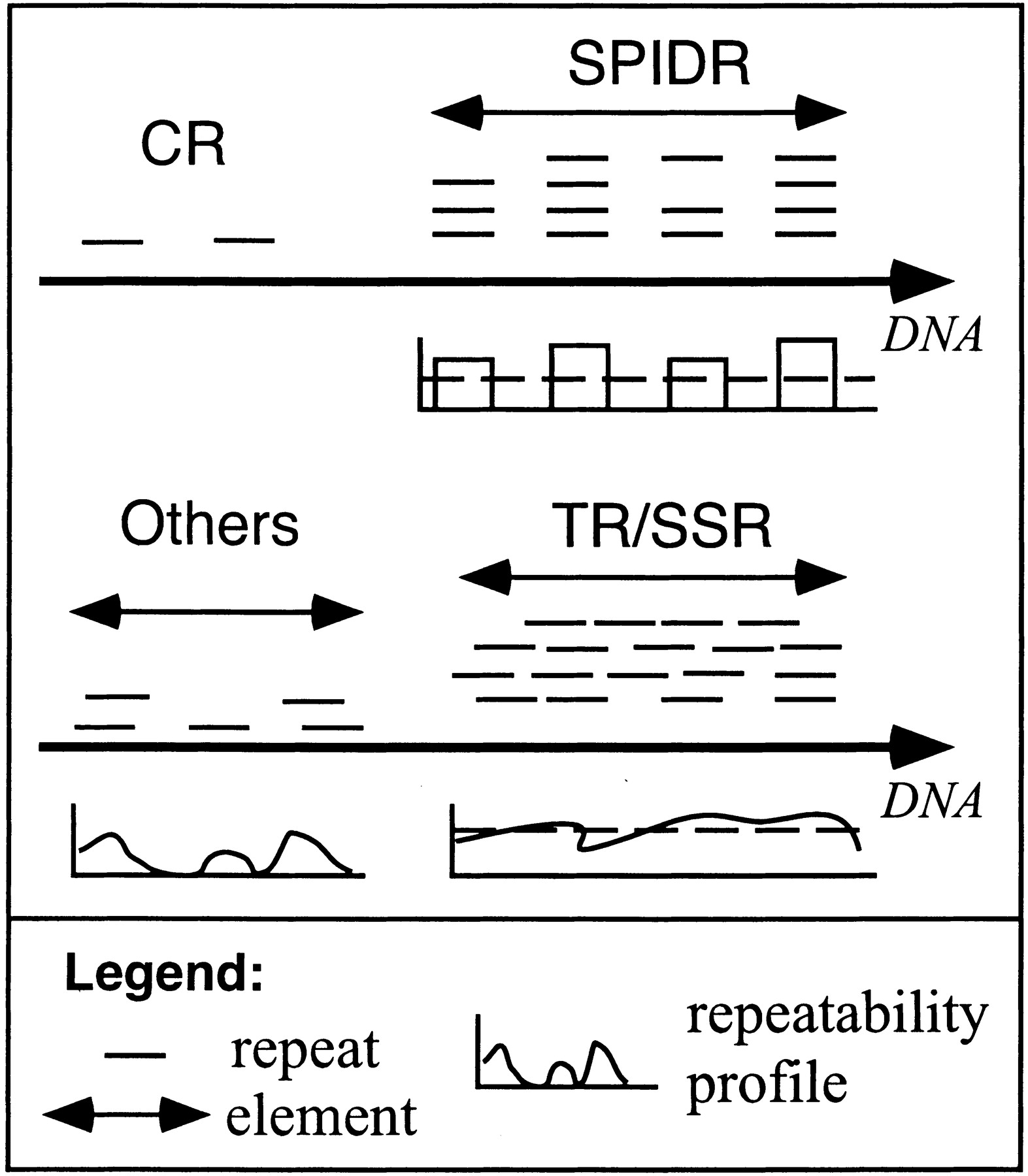 The output of reputer consists of two-copy repeats that are classed into elements after being clustered together regarding their position in the chromosome and their overlapping with other repeats. CRs are composed of shortly spaced nonoverlapping nontandem repeats. SPIDRs contain multiple nontandem occurrences of repeats, whose spacers show no significant similarity. TRs/SSRs are composed of tandem motifs, which in SSRs are smaller than 6 nt, whereas in TRs they are larger. The elements that cannot be unambiguously classified are grouped as “others.” The repeatability profiles measure the extent of repeatability of each region of the element elsewhere in the element (see Methods).