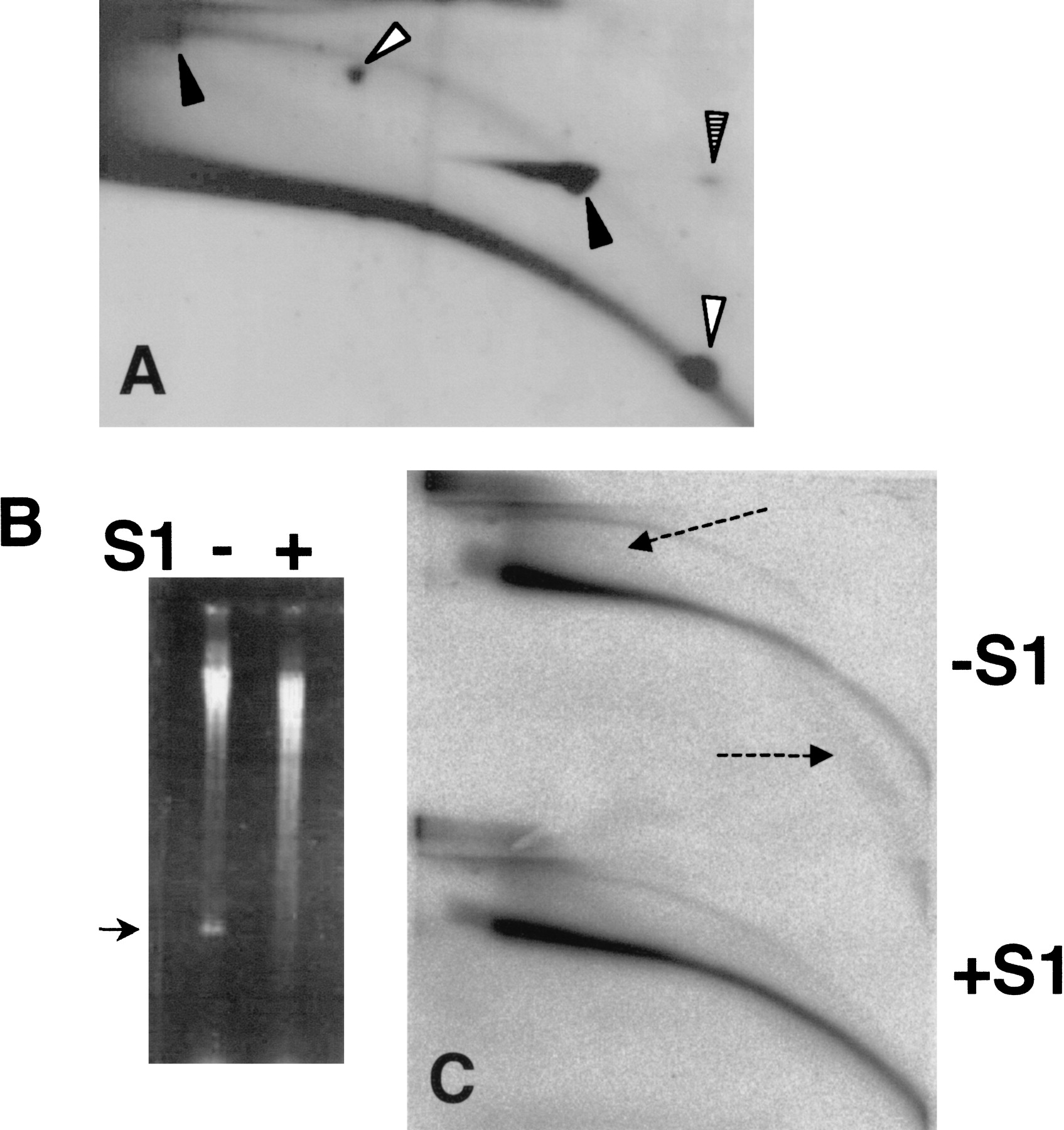 eccDNA is made of relaxed circles. (A) DNA from early embryos, mixed with pUC18-derived plasmids (of 3.3 and 11.2 kb), was separated on a 2D gel. The blot was hybridized with total genomic probe and then with the plasmid probe (pUC18). Superposition of the two autoradiograms shows comigration of the Drosophila eccDNA arc with the relaxed forms of each plasmid (solid arrowheads). The supercoiled plasmid forms migrated to positions below the eccDNA arc (open arrowheads). Stippled arrowhead marks a supercoiled form that was nicked during the first dimension and migrated as a relaxed form in the second dimension (Cohen and Lavi 1996). (B,C) eccDNA is resistant to S1 nuclease. Total genomic DNA from Drosophila early embryos was mixed with M-13-derived single-stranded DNA plasmid and treated with S1 nuclease. A sample was taken before adding the enzyme (-S1), and the other sample after incubation of 5 min with S1 nuclease. (B) The ethidium bromide staining of the first dimension. Arrow indicates the single-stranded marker that disappeared following S1 nuclease digestion. (C) The hybridization pattern of total genomic probe. eccDNA remained unchanged, but single-stranded genomic DNA (dashed arrows) disappeared.