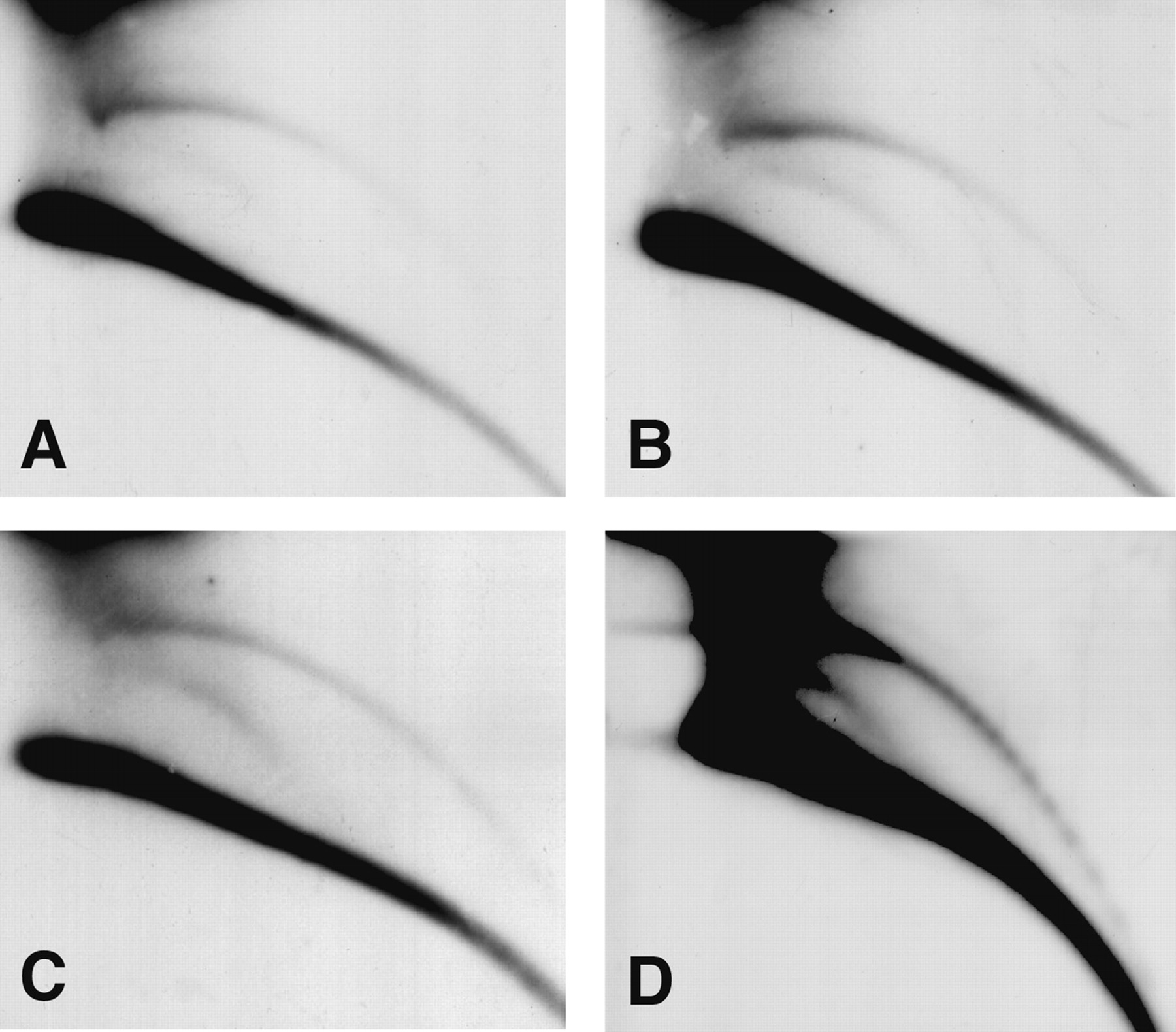 Mutations in okra do not affect eccDNA. DNA from adult flies carrying the following genotypes was separated on 2D gel: (A,D) okrA17-11/okrAG; (B) okrA17-11/Df(2L)JS17; (C) okrA17-11/CyO. The blots in panels A—C were hybridized with total genomic DNA probe; in panel D, a 5S rDNA probe was used. No change in the relative amount of eccDNA was observed in the mutant genotypes compared with the heterozygous one. The circular 5S rDNA multimer organization in the mutants is similar to that observed in the wild type (cf. panel D to Fig. 4).