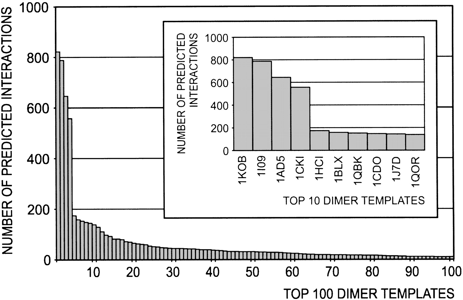 Structural groups of predicted interactions: the number of predictions assigned to the protein complexes in our dimer database. The 100 most populous complexes are shown. The inset is an enlargement for the top 10 complexes.