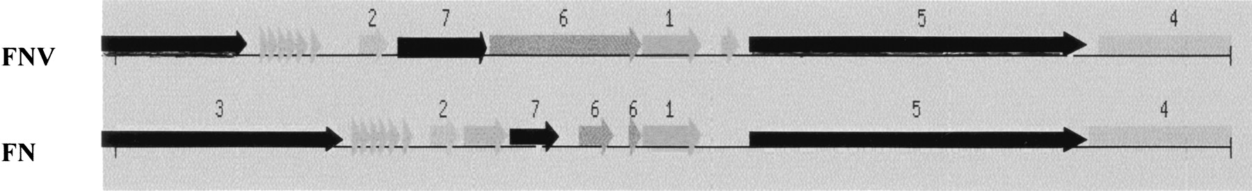 Contig display of the two Fusobacterium sub spp. genomes showing gain of functions in FNV. Similarly colored ORFs (arrows) indicate the presence of similar genes. (1) ATPase associated with chromosome architecture; (2) hypothetical protein; (3) O-linked GLCNAC transferase; (4) Xaa-Pro peptidase; (5) serine protease; (6) Na+-linked D-alanine glycine permease (truncated in FN); (7) glycerophosphoryl diester phosphodiesterase; (8) N-linked alanine-glycine permease (truncated in FN). The numbering is based on the bidirectional best hit.