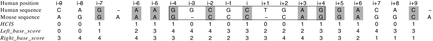 Illustration of the GLASS alignment of human and mouse orthologs, Human Comparative Indicator Sequence (HCIS), and base scores for local windows of length 5. HCIS is essentially the output of the global alignment system. It is defined as a binary sequence with 1 indicating a match and 0 a mismatch/gap in the alignment. LBS/RBS at position i is the number of matches in the local window of length k (5 in the example, 20–30 in the study) that ends/starts at position i.