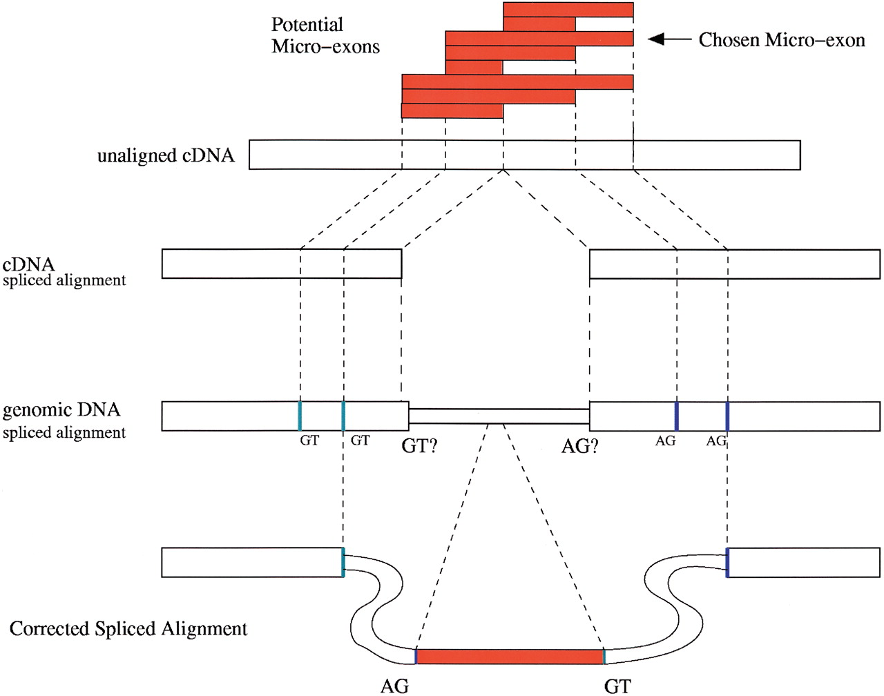 Spliced alignment correction algorithm. Combinations of consensus donor and acceptor splice sites adjacent to the flawed alignment boundaries are used to enumerate all potential micro-exons within the cDNA sequence. One of the potential micro-exons is localized to the genomic DNA intervening the alignment segments, flanked by consensus splice sites, yielding the identity and position of the newly discovered micro-exon.