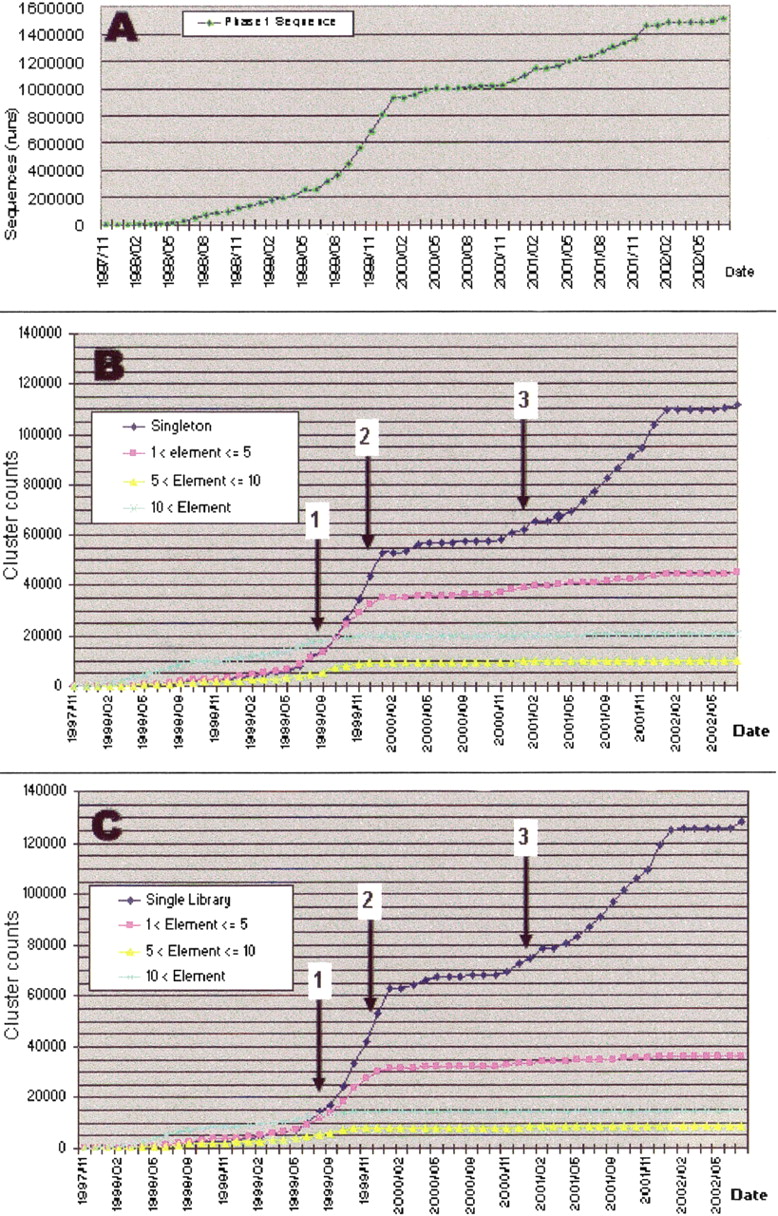 In the course of the gene discovery project (top), we monitored the appearance of singletons vs. clusters of various classes of size (middle) and number of libraries in which they appeared (bottom). Arrows 1, 2, and 3 show the date when increasingly larger subtracting drivers, respectively, consisted of 13,500, 37,500, and 126,000 rearrayed clusters, and were introduced for cDNA library subtraction.