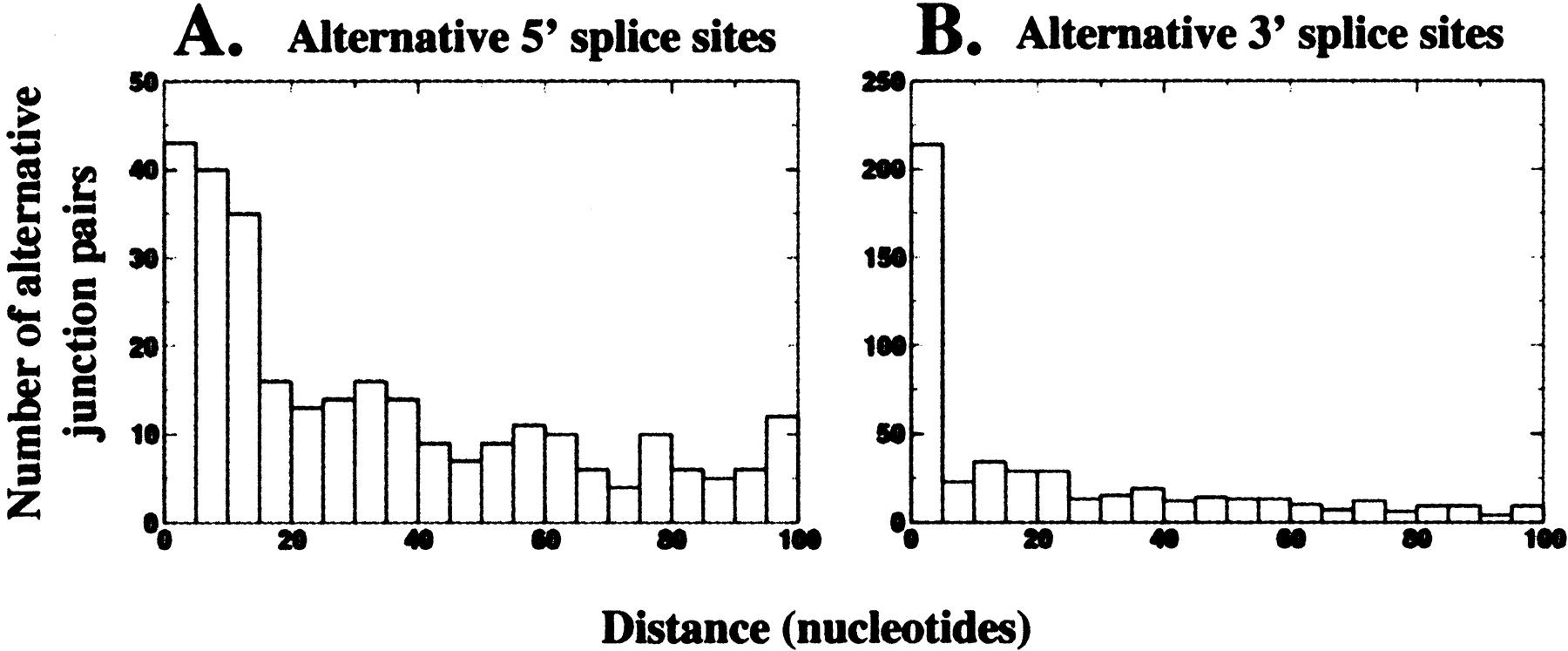 Distribution of distances between alternative splice sites: (A) 5′-splice sites; (B) 3′-splice sites. Note that we only show the distribution up to a distance of 100 nt.