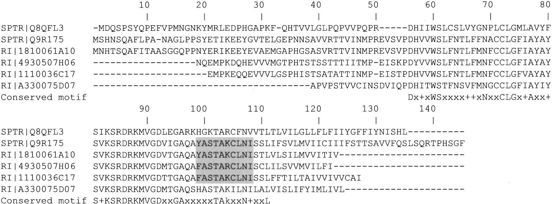 The alignment of conceptual translations of the four candidate novel mouse genes of the family 1-8 of IFN-inducible proteins with representative sequences from rainbow trout (Q8QFL3) and rat (Q9R175). A conserved motif characteristic for the members of interferon-induced 1-8 family of proteins in mice, rats, humans, cattle, and trout is shown with the alignment. Capital letters in the consensus motif stand for identical residues, + for conserved residues (aliphatic—I,V,L, or M; positively charged—K or R; aromatic—F,Y, or W), and x for any residue. The ubiquitin conjugating enzyme E2 active site motif in 1810061A10 [25] and a similar motif in 4930507H06 are shaded. SPTR stands for SWISS-PROT/TrEMBL database [15], and RI stands for RIKEN clone.
